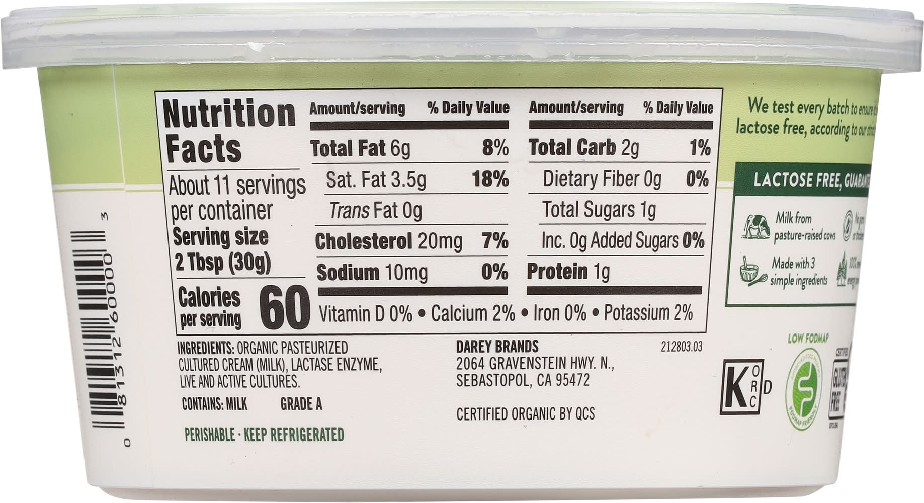 Ingredients: Organic Pasteurized Cultured Cream (Milk), Lactase Enzyme, Live and Active Cultures Contains: Milk