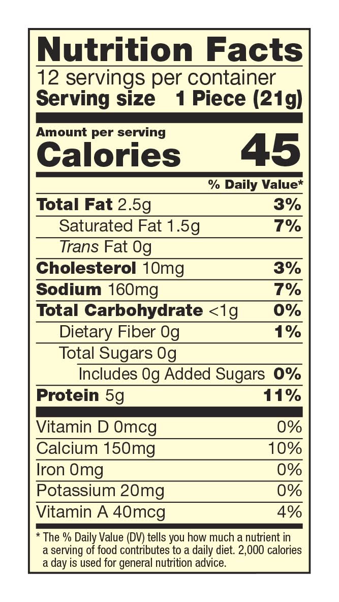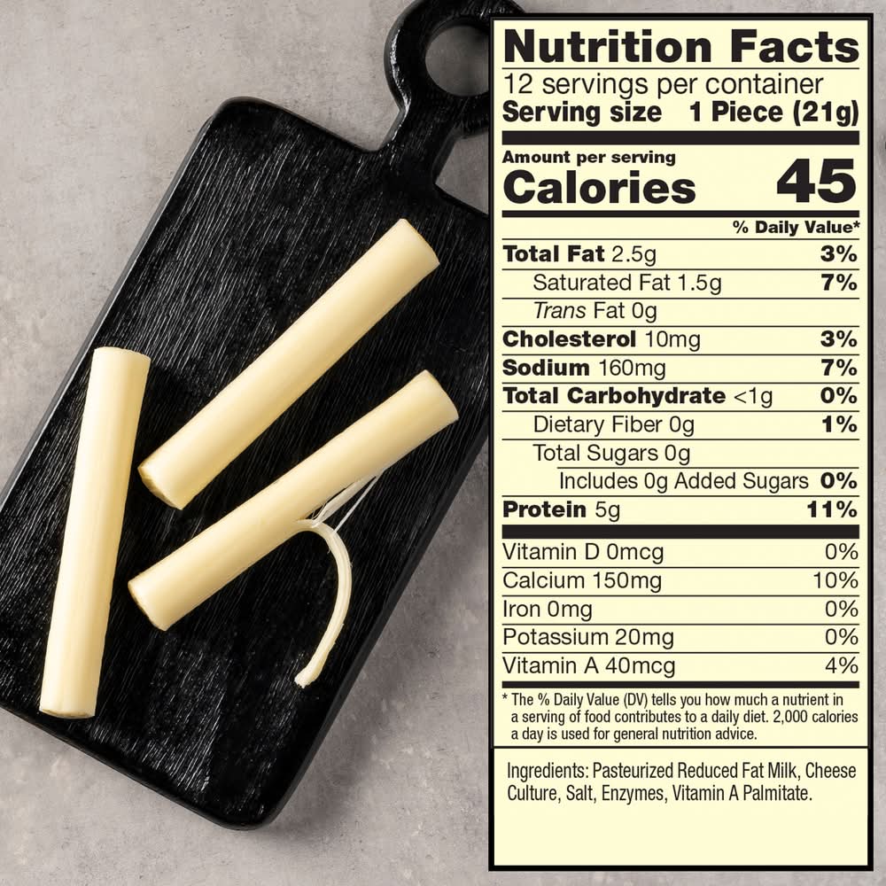 The perfect snack for both kids and adults, this Sargento String Cheese contains less fat as compared to Sargento Low Moisture Mozzarella Natural Cheese, but with all the mild, milky Mozzarella flavor you crave. String cheese is always a great snack on its own but it’s extra delicious paired with fruit, veggies or crackers. Conveniently individually wrapped, string cheese is an ideal option for on-the-go snacking. • Pack size: 12 • Sargento Foods Inc., One Persnickety Place, Plymouth, WI, 53073 • Packaging: Reusable