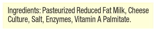 Ingredients: Pasteurized Reduced Fat Milk, Cheese Culture, Salt, Enzymes, Vitamin A Palmitate. Contains: Milk Contains'