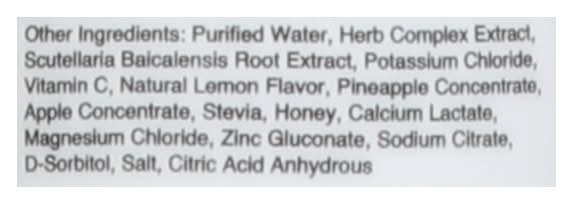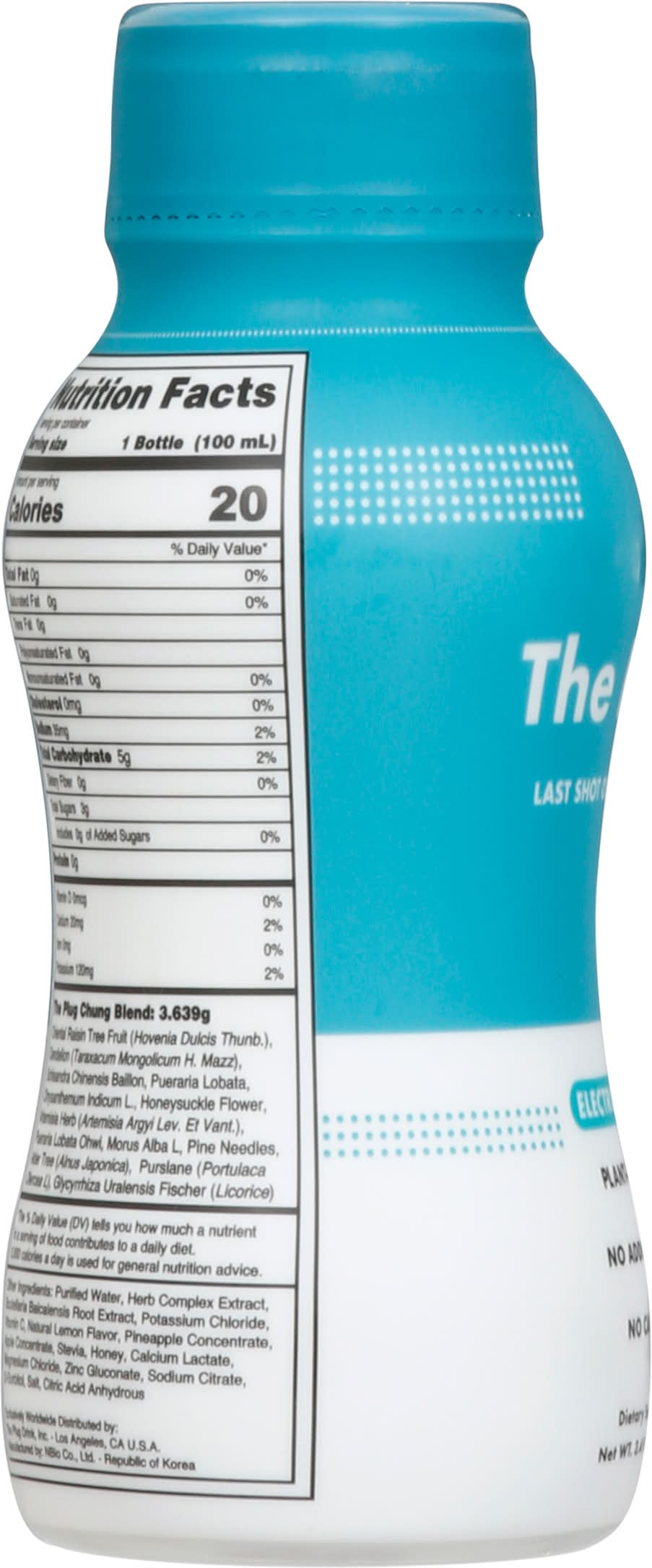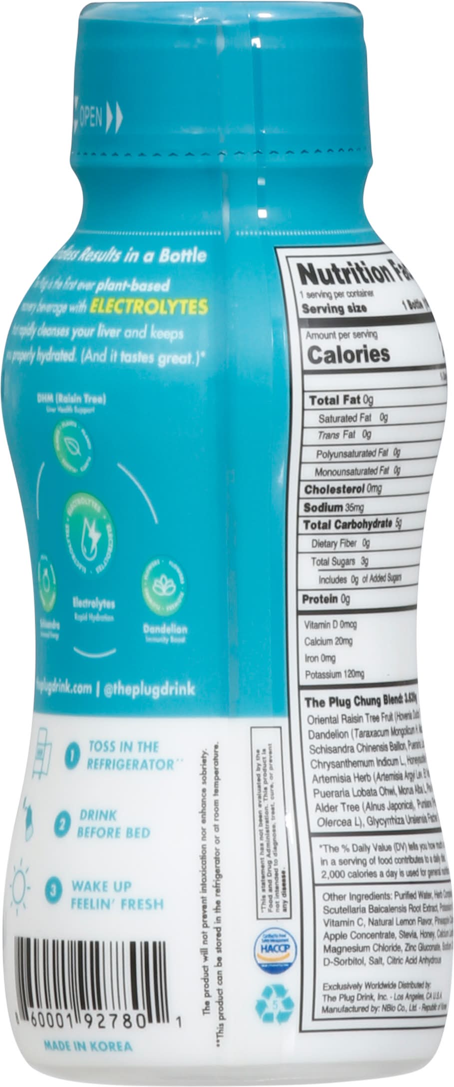 Ingredients: The Plug Blend: Oriental Raisin Tree Fruit (Hovenia Dulcis Thunb, ), Dandelion (Taraxacum Mongolicum H. Mazz), Schisandra Chinensis Baillon, Pueraria Lobata, Chrysanthemum Indicum L, Honeysuckle Flower, Artemesia Herb (Artemisia Argyl Lev. Et Vant), Puerari Lobata Ohwi, Morus Alba L, Pine Needles, Alder Tree (Alnus Japonica), Purslane (Portulaca Olercea L), Glycyrrhiza Uralensis Fischer (Licorice). Other Ingredients: Purified Water, Herb Complex Extract, Sculellaria Balcalensis Root Extract, Potassium Chloride, Vitamin C, Natural Lemon Flavor, Pineapple Concentrate, Apple Concentrate, Stevia, Honey, Calcium Lactate, Magnesium Chloride, Zinc, Gluconate, Sodium Citrate, D-Sorbitol, Salt, Citric Acid Anhydrous