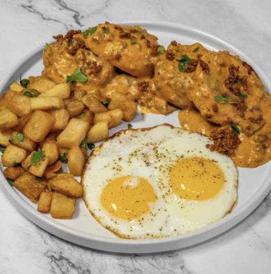 Two fluffy biscuits smothered in our creamy chorizo gravy paired with eggs and breakfast potatoes.