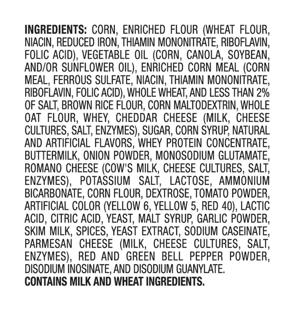 Ingredients: Corn, Enriched Flour (Wheat Flour, Niacin, Reduced Iron, Thiamin Mononitrate, Riboflavin, Folic Acid), Vegetable Oil (Corn, Canola, Soybean, and/or Sunflower Oil), Enriched Corn Meal (Corn Meal, Ferrous Sulfate, Niacin, Thiamin Mononitrate, Riboflavin, Folic Acid), Whole Wheat, and Less than 2% of Salt, Brown Rice Flour, Corn Maltodextrin, Whole Oat Flour, Whey, Cheddar Cheese (Milk, Cheese Cultures, Salt, Enzymes), Sugar, Corn Syrup, Natural and Artificial Flavors, Whey Protein Concentrate, Buttermilk, Onion Powder, Monosodium Glutamate, Romano Cheese (Cow's Milk, Cheese Cultures, Salt, Enzymes), Potassium Salt, Lactose, Ammonium Bicarbonate, Corn Flour, Dextrose, Tomato Powder, Artificial Color (Yellow 6, Yellow 5, Red 40), Lactic Acid, Citric Acid, Yeast, Malt Syrup, Garlic Powder, Skim Milk, Spices, Yeast Extract, Sodium Caseinate, Parmesan Cheese (Milk, Cheese Cultures, Salt, Enzymes), Red and Green Bell Pepper Powder, Disodium Inosinate, and Disodium Guanylate Contains: Milk, Wheat, Oat, Lactose, Soybeans
