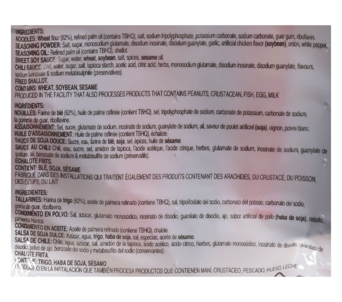 Ingredients: Noodles: Wheat Flour (62%), Refined Palm Oil (Contains TBHQ), Salt, Sodium Tripolyphosphate, Potassium Carbonate, Sodium Carbonate, Guar Gum, Riboflavin. Seasoning Powder: Salt, Sugar, Monosodium Glutamate, Disodium Inosinate, Disodium Guanylate, Garlic, Artificial Chicken Flavor (Soybean), Onion, White Pepper. Seasoning Oil: Refined Palm Oil (Contains TBHQ), Shallot. Sweet Soy Sauce: Sugar, Water, Wheat, Soybean, Salt, Spices, Sesame Oil. Chili Sauce: Chili, Water, Sugar, Tapioca Starch, Acetic Acid, Citric Acid, Herbs, Monosodium Glutamate, Disodium Inosinate, Disodium Guanylate, Flavours, Sodium Benzoate & Sodium Metabisulphite (Preservatives). Fried Shallot Contains: Wheat, Soybeans, Sesame, Peanuts, Crustacean Shellfish, Fish, Eggs, Milk