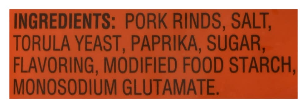 Ingredients: Pork Rinds, Salt, Torula Yeast, Paprika, Sugar, Flavoring, Modified Food Starch, Monosodium Glutamate