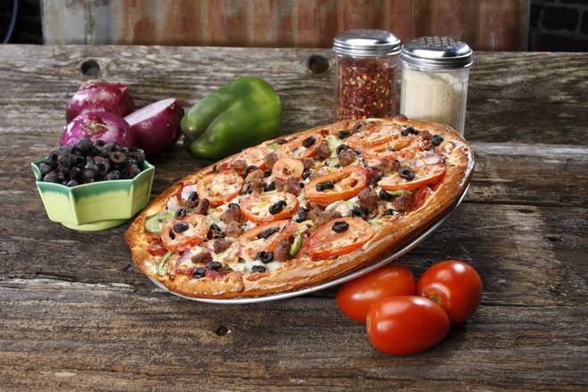 Italian sausage, pepperoni, salami, our savory tomato sauce, mozzarella, a sprinkle of cheddar, green peppers, fresh mushrooms, red onions, black olives and vine-ripened tomatoes. cal range/serving: 270-660