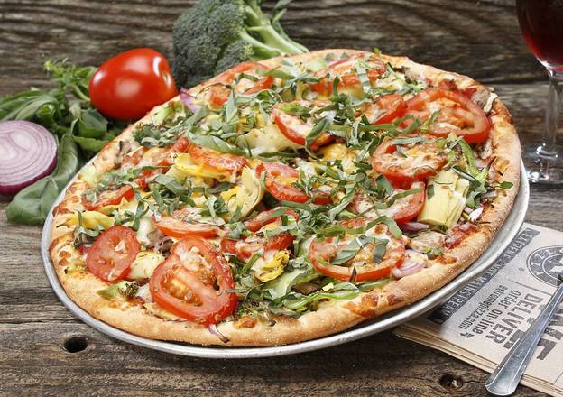 Our drag it thru the garden is topped with mushrooms, green peppers, red onions, broccoli, roma tomato, basil, tomato sauce, mozzarella, cheddar, artichokes.