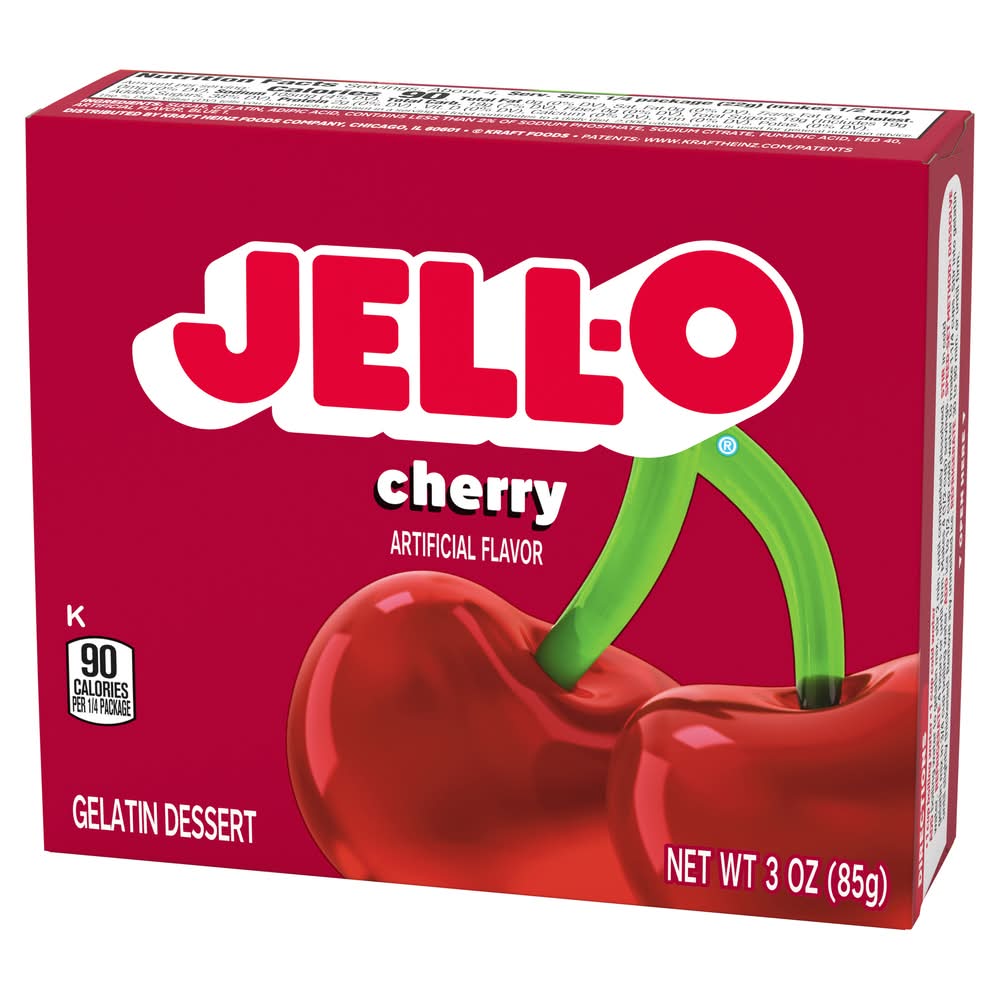 Snack happy. Jell-O Cherry Artificially Flavored Gelatin Dessert Mix lets you add some wonder to your day with a delicious snack. Spoon up a smile with our artificially flavored cherry Jell-O gelatin that contains 80 calories per serving. Our colorful, jiggly treat is perfect for everyday snacking or special occasions with family and friends. Additionally, our gelatin dessert mix is a versatile ingredient for creating desserts like poke cakes, parfaits, pretzel salads, rainbow layer cakes and more. Our artificially flavored cherry gelatin dessert is easy to prepare. Simply add 1 cup boiling water to the gelatin mix, stir for 2 minutes until completely dissolved, stir in 1 cup cold water, then refrigerate for 4 hours or until firm. Each Jell-O gelatin dessert mix is individually packaged in a 3-ounce sealed pouch and makes 4, 1/2-cup servings. Kraft Heinz Foods Company, Chicago,IL,60601