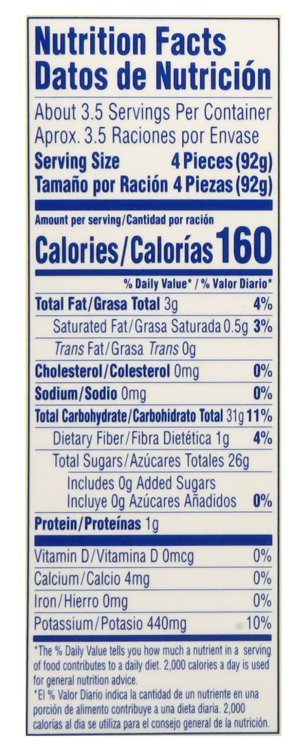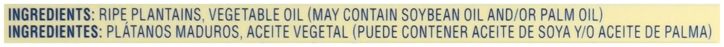 Ingredients: Ripe Plantains, Vegetable Oil (May Contain Soybean Oil and/or Palm Oil) Contains: Soybeans