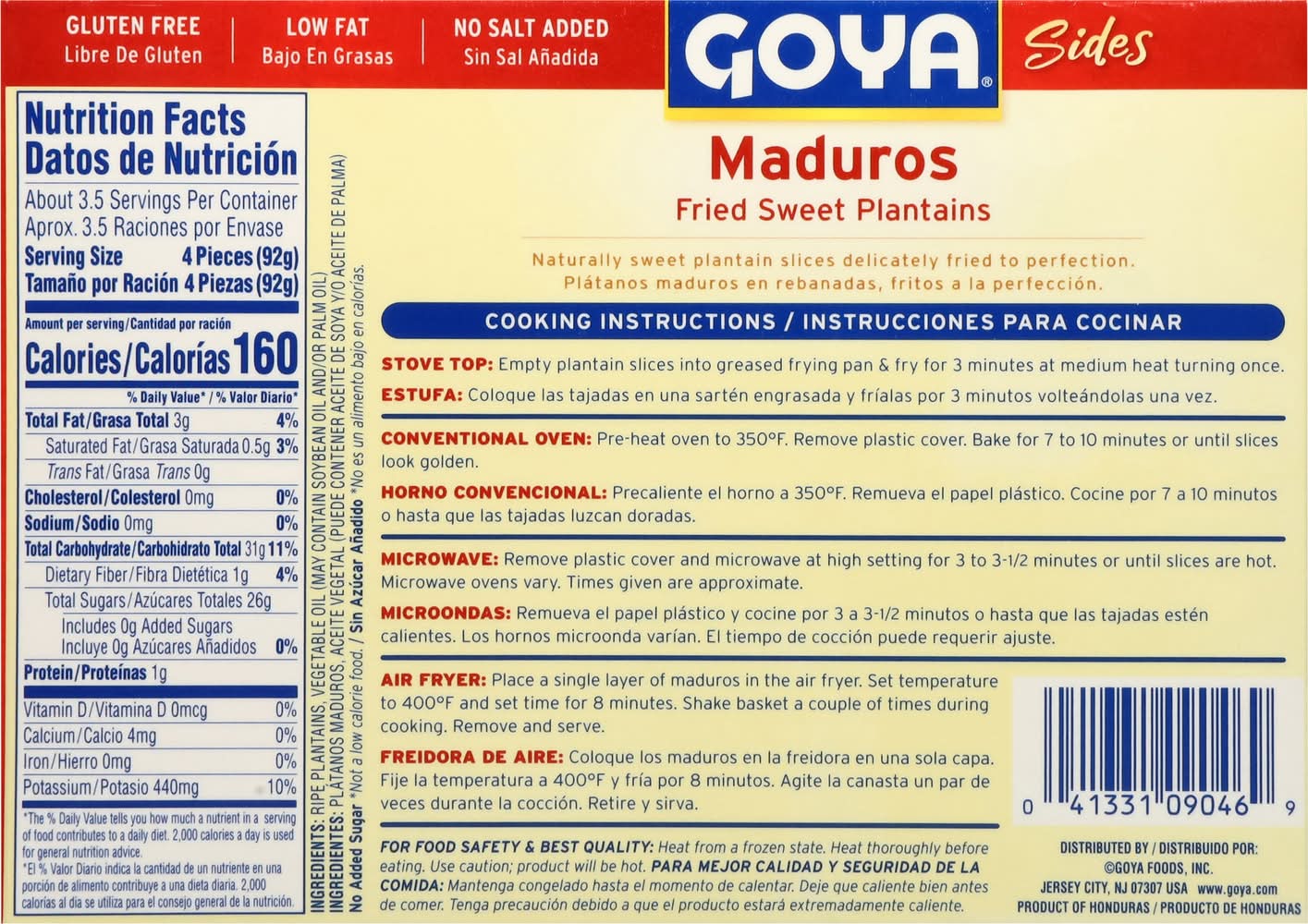 Fried sweet plantains. Naturally sweet plantain slices delicately fried to perfection. Gluten free. Low fat. No salt added. No added sugar (Not a low calorie food). This Caribbean staple is the ideal companion to any main dish. Or use as an ingredient in delicious Hispanic specialties. Product of Honduras. Goya Foods, Inc., Secaucus, NJ 07096