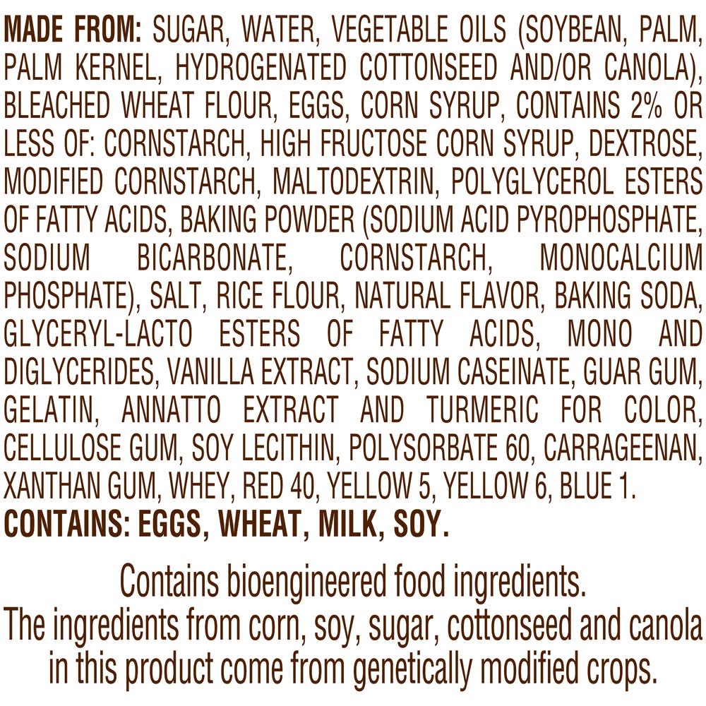 Ingredients: Sugar Water Vegetable Oils (Soybean, Palm, Palm Kernel, Hydrogenated Cottonseed And/Or Canola) Bleached Wheat Flour Eggs Corn Syrup Contains 2% Or Less Of: Cornstarch High Fructose Corn Syrup Dextrose Modified Cornstarch Maltodextrin, Polyglycerol Esters Of Fatty Acids Baking Powder (Sodium Acid Pyrophosphate, Sodium Bicarbonate, Cornstarch, Monocalcium Phosphate) Salt Rice Flour Natural Flavor Baking, Soda Glyceryl-Lacto Esters Of Fatty Acids Mono And Diglycerides Vanilla Extract Sodium Caseinate Guar Gum Gelatin Annatto Extract And Turmeric For Color Cellulose Gum Soy, Lecithin Polysorbate 60 Carrageenan Xanthan Gum Whey RED 40 YELLOW 5 YELLOW 6 BLUE 1. Contains: Egg Wheat Milk Soy Contains: Gluten, Milk/Dairy, Soybean, Wheat, eggs
