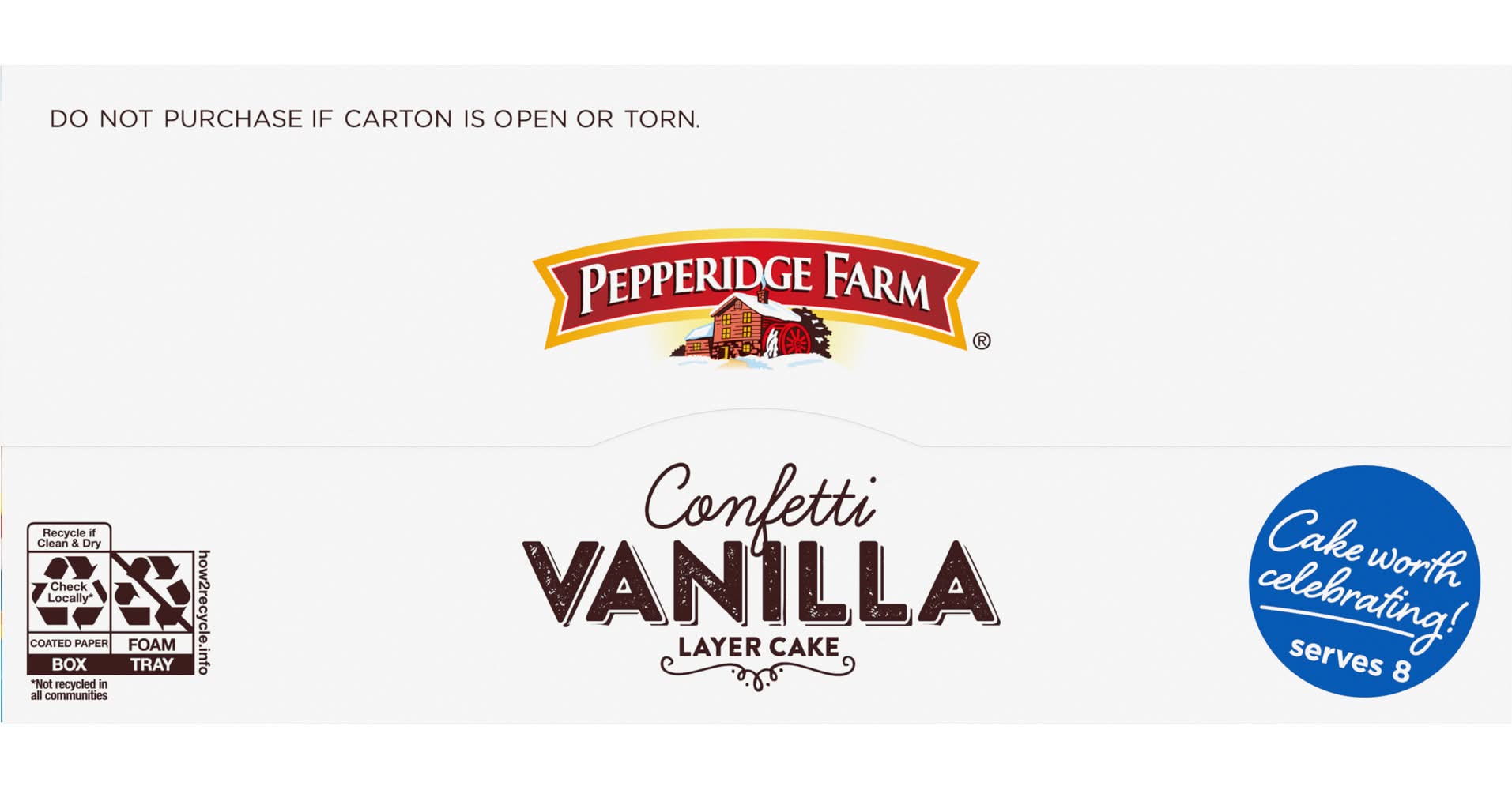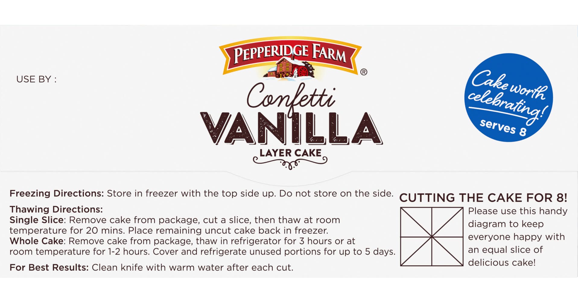 With Pepperidge Farm layer cakes, you can celebrate everyday Our Confetti Vanilla Layer cake is yummy and moist topped with delicious frosting. Simply thaw and serve for an easy and delicious dessert. At Pepperidge Farm, baking is more than a job. It's a real passion. • Flavor: Vanilla • Pepperidge farm, inc., Norwalk,CT,06856 • Packaging: Reusable