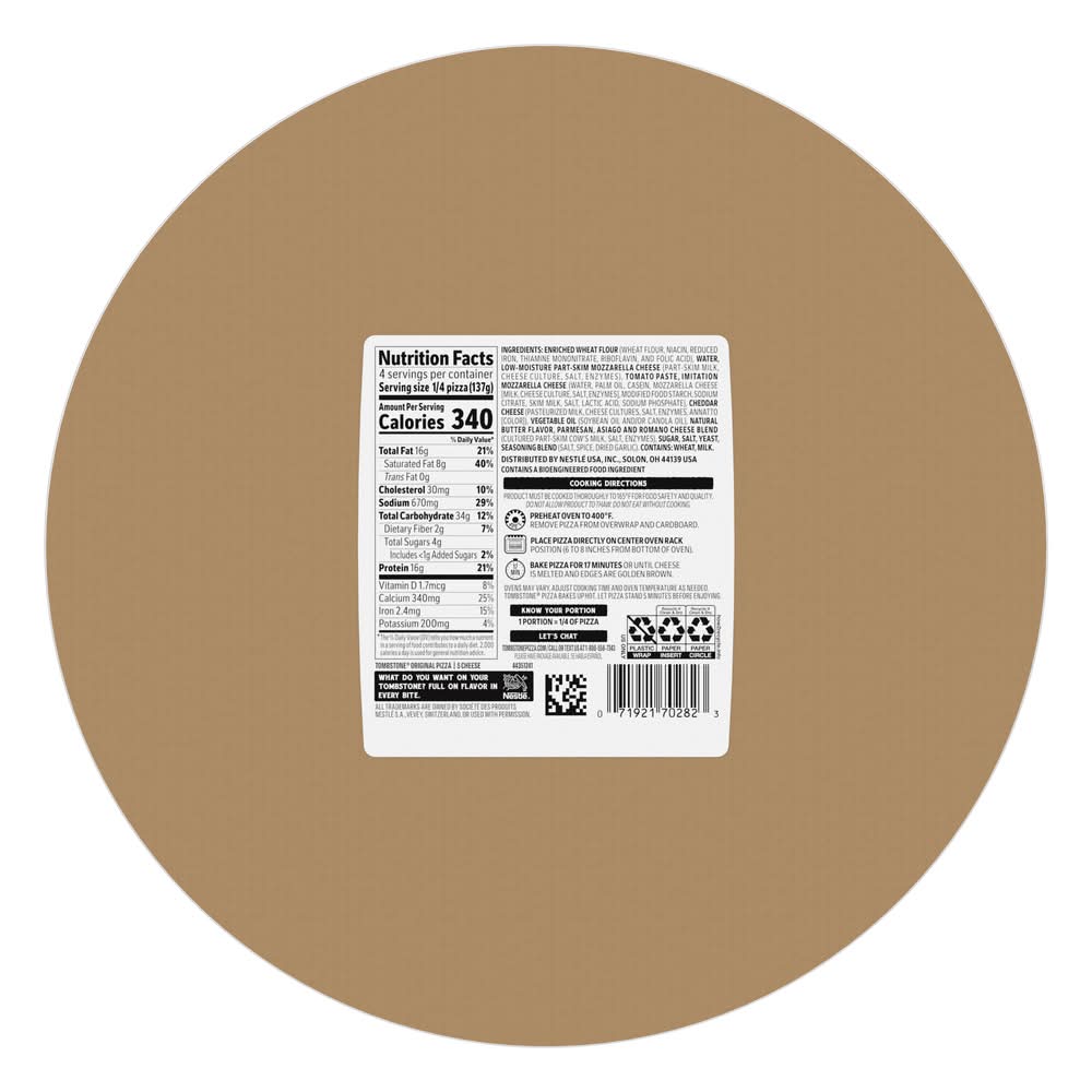 Tombstone 5 Cheese Pizza is not just another frozen pizza, it's a full-on flavor experience that's sure to steal the spotlight at any pizza party. This frozen cheese pizza is loaded with bold and zesty toppings -- our buttery, crispy crust is smothered in a zesty sauce, and covered with gooey real cheeses, including mozzarella, cheddar, parmesan, asiago, and romano. Ready in just seventeen minutes, this frozen cheese pizza is the perfect easy dinner for when spontaneous pizza hunger strikes — simply bake it up and enjoy pub-inspired deliciousness right at home. With one of these bad boys in your freezer, you’ll always have a party pizza or frozen dinner ready to go. Born in a bar in 1962, Tombstone has perfected the art of frozen cheese pizza, making it the go-to choice for an effortless crowd-pleaser. • Brand: Tombstone • Flavor: Cheese