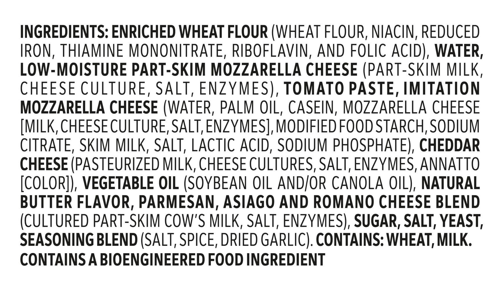 Ingredients: ENRICHED WHEAT FLOUR (WHEAT FLOUR, NIACIN, REDUCED IRON, THIAMINE MONONITRATE, RIBOFLAVIN, AND FOLIC ACID), WATER, LOW-MOISTURE PART-SKIM MOZZARELLA CHEESE (PART-SKIM MILK, CHEESE CULTURE, SALT, ENZYMES), TOMATO PASTE, IMITATION MOZZARELLA CHEESE (WATER, PALM OIL, CASEIN, MOZZARELLA CHEESE [MILK, CHEESE CULTURE, SALT, ENZYMES], MODIFIED FOOD STARCH, SODIUM CITRATE, SKIM MILK, SALT, LACTIC ACID, SODIUM PHOSPHATE), CHEDDAR CHEESE (PASTEURIZED MILK, CHEESE CULTURES, SALT, ENZYMES, ANNATTO [COLOR]), VEGETABLE OIL (SOYBEAN OIL AND/OR CANOLA OIL), NATURAL BUTTER FLAVOR, PARMESAN, ASIAGO AND ROMANO CHEESE BLEND (CULTURED PART-SKIM COW'S MILK, SALT, ENZYMES), SUGAR, SALT, YEAST, SEASONING BLEND (SALT, SPICE, DRIED GARLIC), . Contains: CONTAINS: WHEAT, MILK.