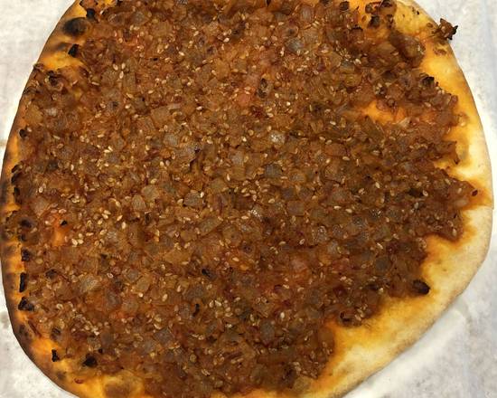 A mix of onion, pepper paste, tomato paste, and olive oil on fresh pita dough.