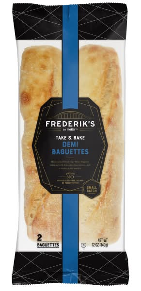 Experience the taste of France with Frederik's by Meijer Take & Bake French Classic Demi Baguettes. Perfect for a quick snack or a complement to your meal, these baguettes offer a convenient and delicious bakery experience right at home. Packaging: Reusable