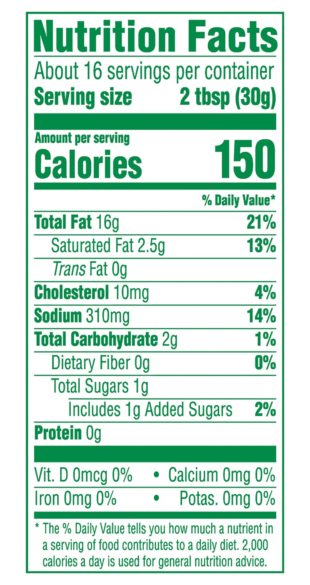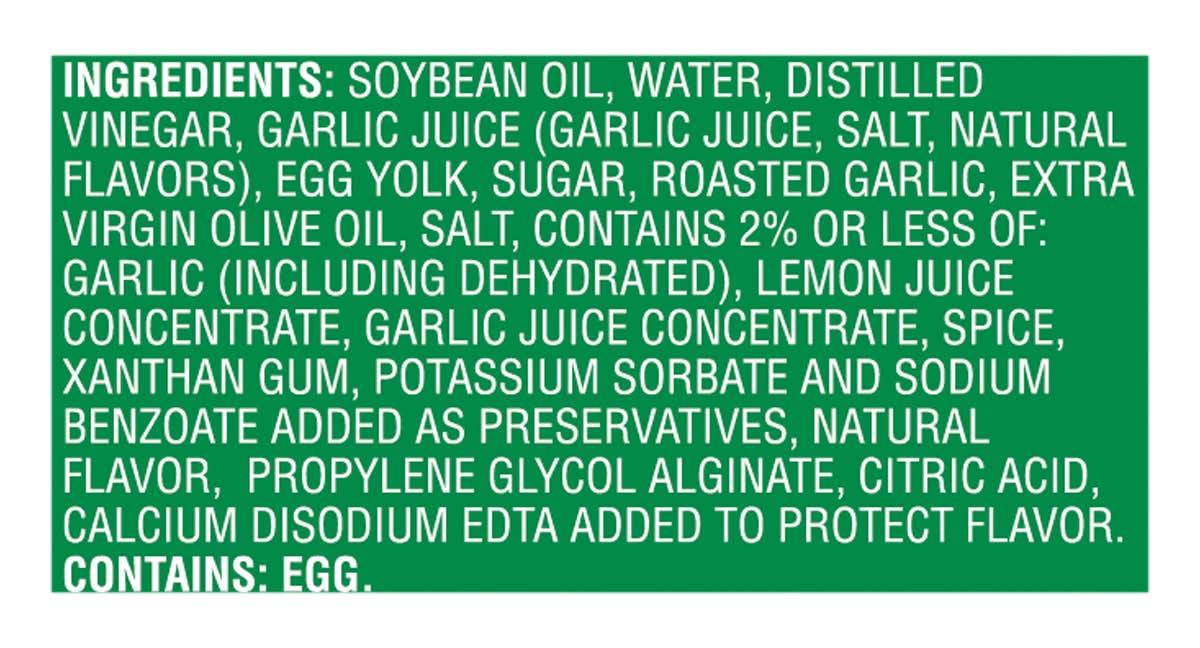 Ingredients: Soybean Oil, Water, Distilled Vinegar, Roasted Garlic Juice (Garlic Juice, Salt, Natural Flavors), Egg Yolk, Sugar, Roasted Garlic, Extra Virgin Olive Oil, Salt, Contains 2% or Less of: Garlic (Including Dehydrated), Lemon Juice Concentrate, Garlic Juice Concentrate, Spice, Xanthan Gum, Potassium Sorbate and Sodium Benzoate Added as Preservatives, Natural Flavor, Propylene Glycol Alginate, Citric Acid, Calcium Disodium EDTA Added to Protect Flavor Contains: Eggs, Soybeans