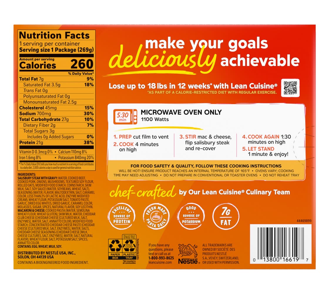 Directions for use: For food safety & quality, follow these cooking instructions. Microwave oven only (1100 watts): Prep: Cut film to vent. Cook: 4 minutes on high. Stir: Mac & Cheese. Flip salisbury steak and re-cover. Cook again 1:30 minutes on high. Let Stand: 1 minute & enjoy. Will be hot! Ensure product reaches an internal temperature of 165 degrees F. Directions developed using 1100 watt microwave oven. Ovens vary; cooking time may need adjusting. Do not prepare in conventional or toaster ovens. Do not reheat tray. Cook thoroughly. Storage recommendation: Keep frozen.