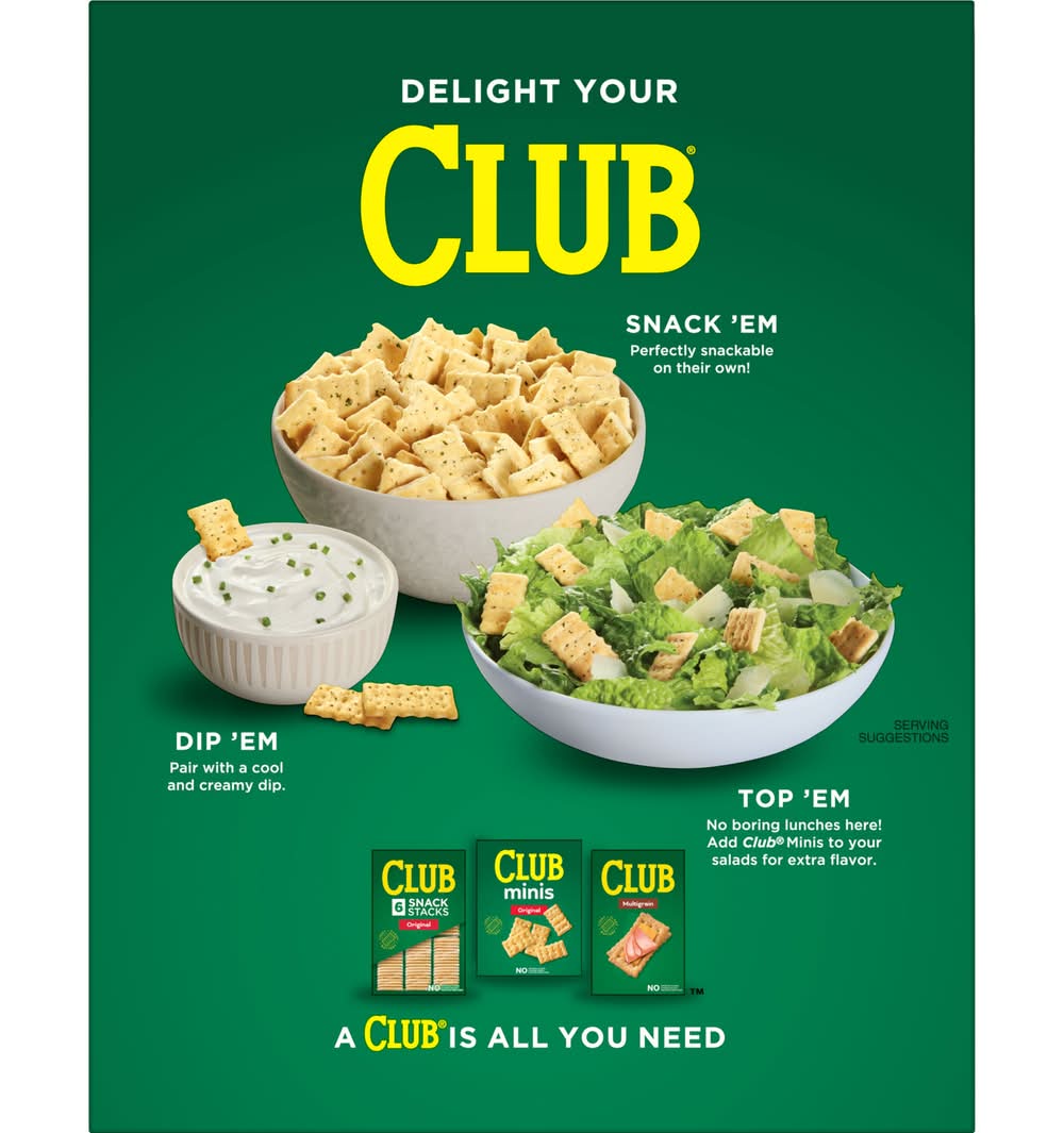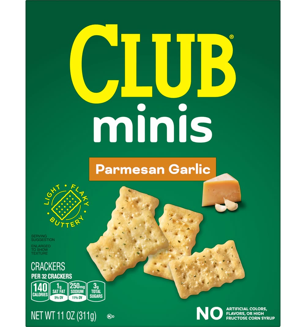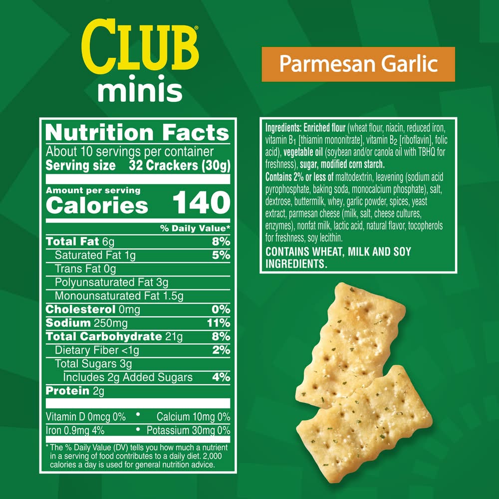 When it's time for close friends and really good snacks, a Club is all you need. Savor the light, flaky, buttery taste of Club Minis crackers wherever you go. Just the right size for a quick snacking moment, these tasty mini crackers are ready-made for easy snacking to help tide you over any time of day. Seasoned with big parmesan garlic flavor, these crackers make a flavor-packed snack; they're an easy win, made with no artificial colors or flavors. A quick snack for work lunches, pack a handful of Club Minis and take these little crackers with you. They're great for an easy salad topping, a soup topper, or pair them with your favorite dips. It’s no fuss, just friends, and really tasty snacks. They deserve to be savored with your closest besties. Club Minis crackers bring buttery goodness in every comforting, easy-to-enjoy bite. • Flavor: Parmesan-garlic • Size: 11 OZ