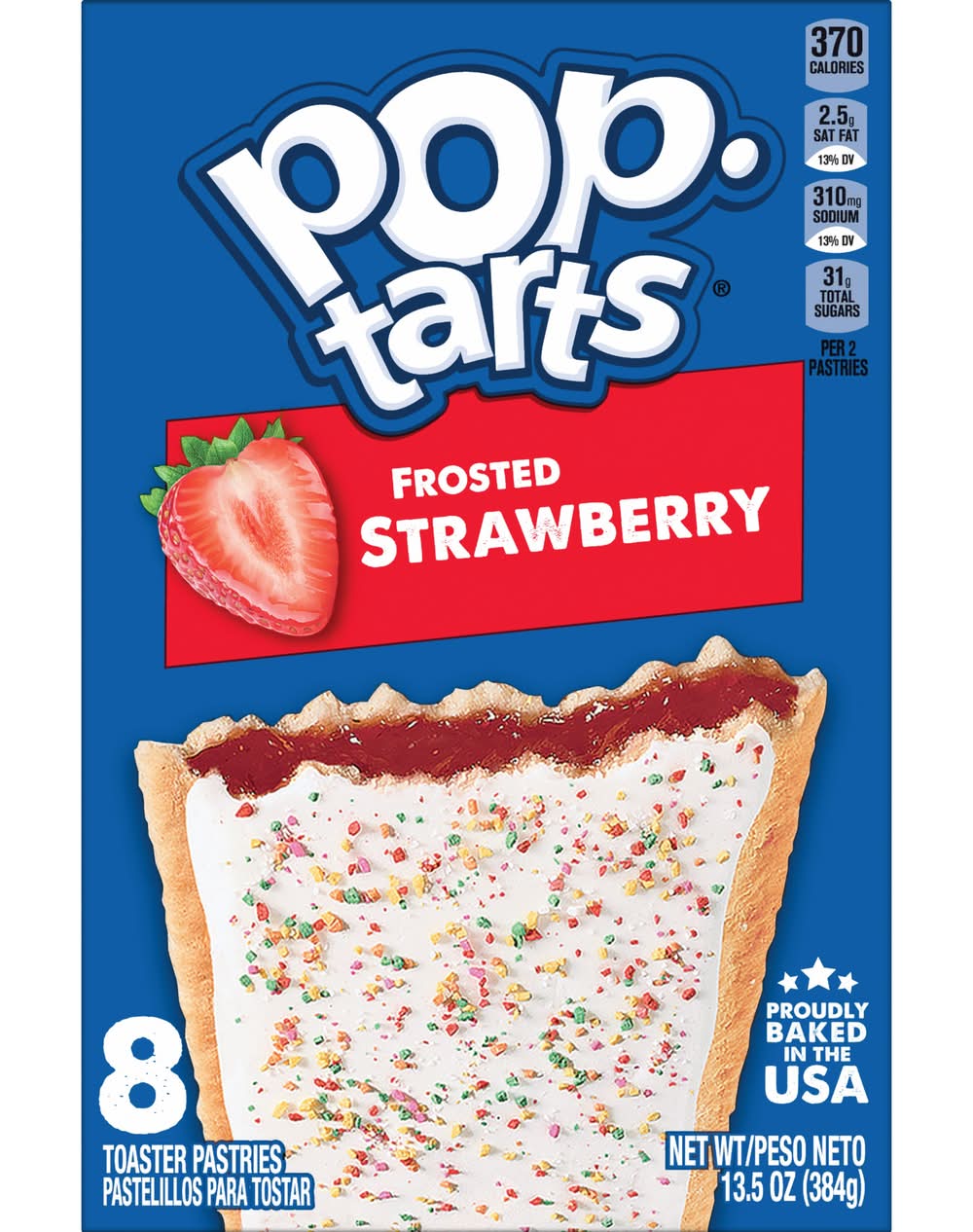 Pop-tarts toaster pastries are the perfect sweet treat at breakfast, for lunch snack time, or dessert. Featuring a sweet strawberry-flavored filling and crunchy sprinkles on a soft pastry crust, this ready to eat treat is perfect for snack time for kids and adults on the go. Pack pop-tarts frosted strawberry in lunchboxes or backpacks when it's time for school snacking, or stock the office pantry with this individually wrapped grab and go adult snack time choice. Pop them in the toaster and pair with milk, create your own ice cream sandwiches, or incorporate into your favorite dessert recipe for a sweet treat. These irresistible snack time options for kids and adults provide a good source of three b vitamins. Stock your pantry with these shelf stable snack alternatives and enjoy ready to eat treats anytime. • Flavor: Strawberry • Size: 8 COUNT • Kellogg Sales Co., Battle Creek, MI, 49016