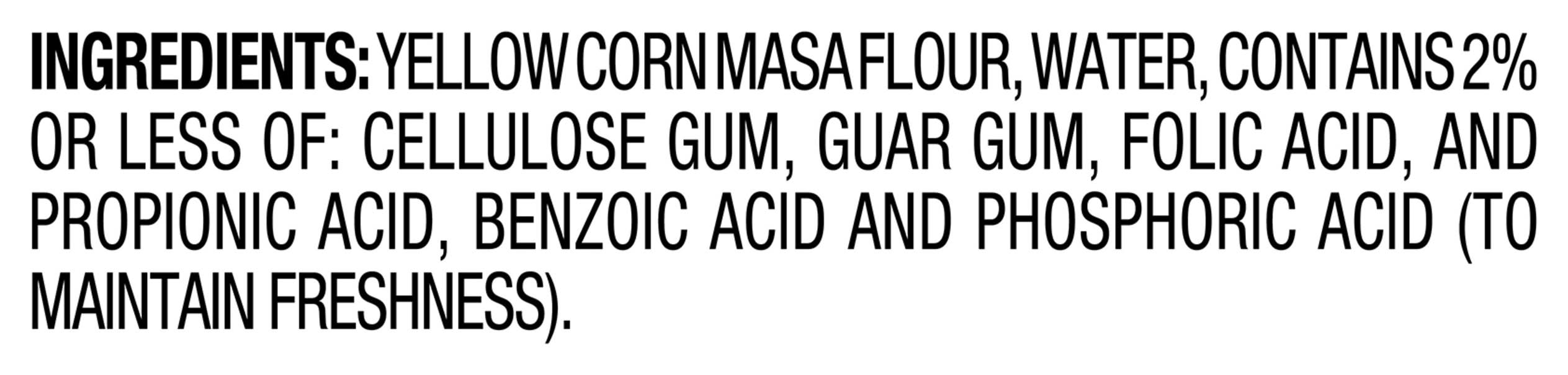 Ingredients: Yellow corn masa flour, water, contains 2% or less of: cellulose gum, guar gum, folic acid, and propionic acid, benzoic acid and phosphoric acid (to maintain freshness).