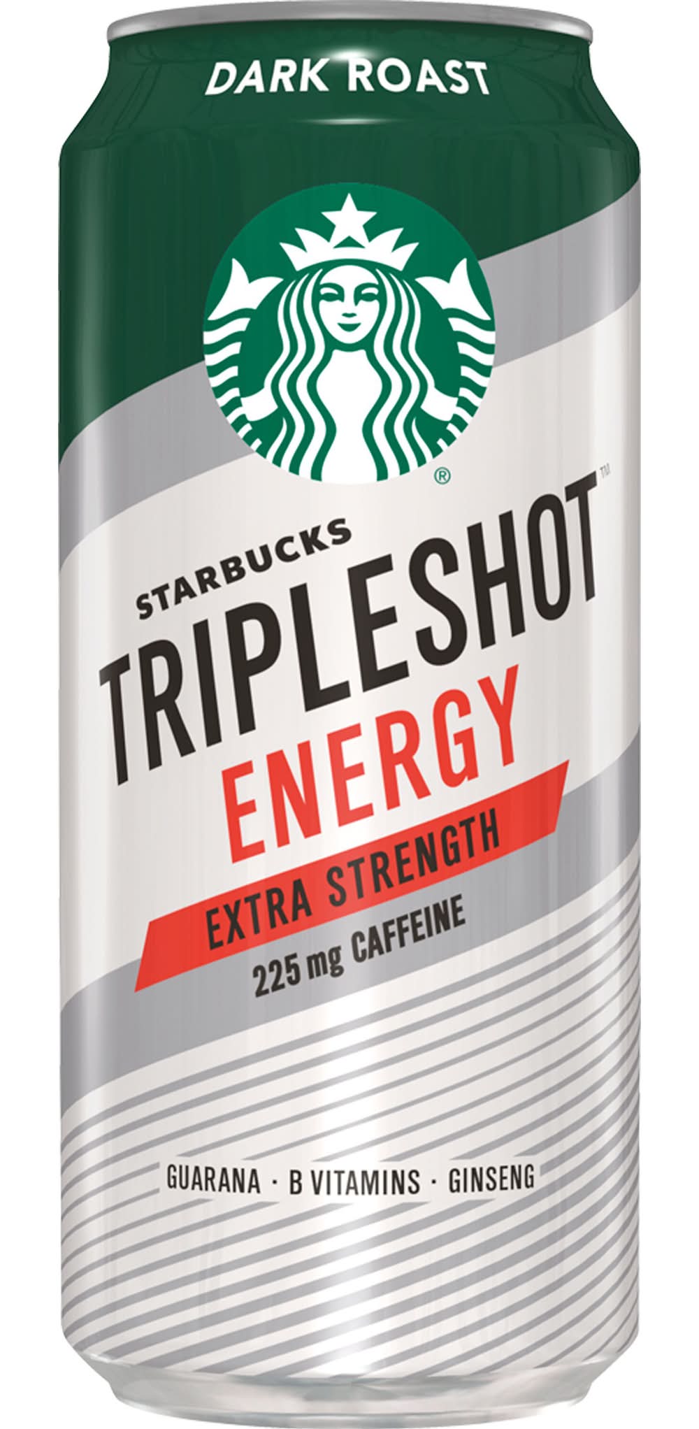 Starbucks Tripleshot Energy Dark Roast Coffee provides a rich, deep flavor and an extra strength boost of energy in a 15 fl oz can. • NORTH AMERICAN COFFEE, Purchase, NY 10577 USA • Packaging: Reusable