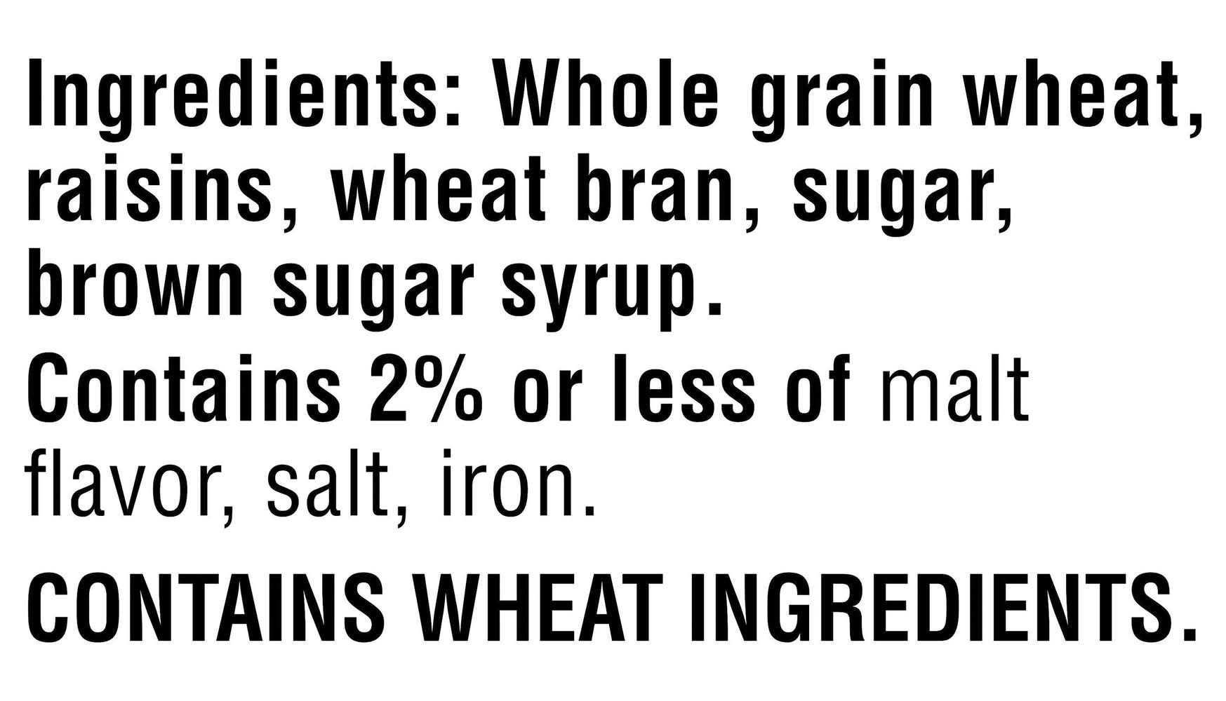 Ingredients: Whole Grain Wheat, Raisins, Wheat Bran, Sugar, Brown Sugar Syrup, Contains 2% or Less of Malt Flavor, Salt, Iron Contains: Wheat