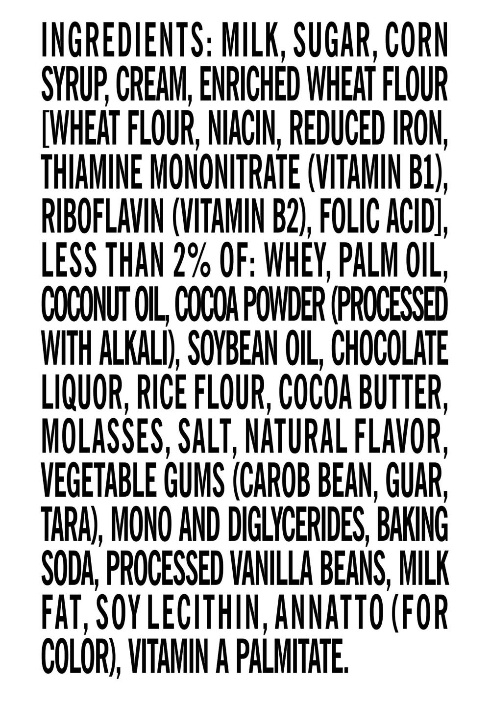 Ingredients: Milk, Chocolate Chip Cookie Dough Pieces, [Wheat, Flour, Sugar, Brown Sugar, Palm Oil, Water, Soybean Oil, Powdered Sugar Sugar, Cornstarch, Chocolate Liquor, Salt, Cocoa, Butter, Natural Flavor Milk, Soy Lecithin, Baking Soda], Sugar, Corn Syrup, Cream Chocolate Flavored Chips [Sugar, Coconut Oil, Cocoa Powder Processed with Alkali, Milkfat, Soy Lecithin an Emulsifier, Vanilla Extract], Contains 2% or Less of the Following: Whey, Carob Bean Gum, Mono and Diglycerides, Natural Flavors, Carrageenan Annatto for Color, Vitamin A Palmitate, Tara Gum, Guar Gum. Contains: Milk, Corn, Wheat, Coconuts, Soybeans
