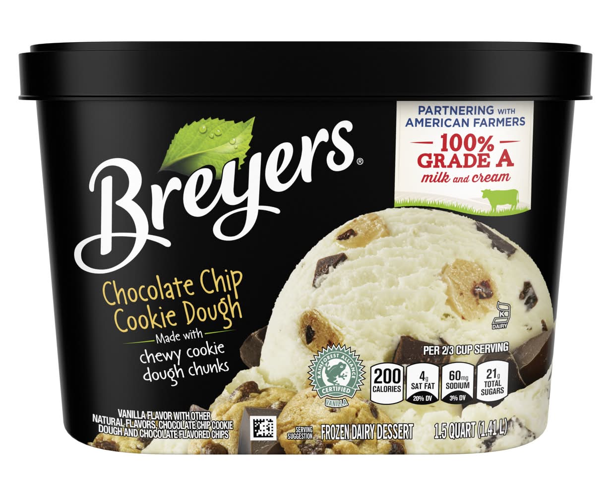 Breyers Frozen Dairy Dessert Chocolate Chip Cookie Dough, 48 oz • Flavor: Vanilla- chocolate chip cookie dough • Unilever, Englewood Cliffs, NJ 07632Phone;800-931-2826