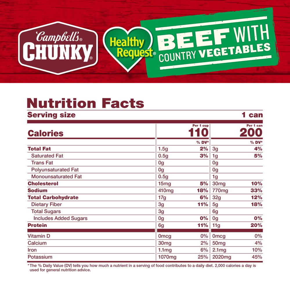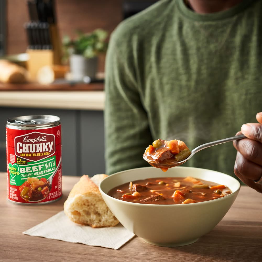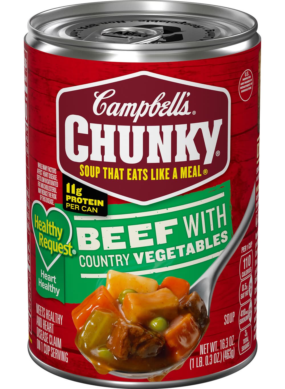 Campbell's Chunky Healthy Request Beef with Country Vegetables is crafted with carrots, potatoes and hearty pieces of tender beef to create a satisfying ready-to-eat soup. Low fat and big in flavor, dive into the savory spoonfuls and enjoy. Campbell's Chunky Healthy Request Beef with Country Vegetables Soup—Soup That Eats Like a Meal. When you need food that works as hard as you do, grab Campbell's Chunky soups. Our big flavor, big pieces and bold ingredients will help you fight back when NFL-sized hunger hits. Available in hearty varieties and tastes that don’t stop, Campbell's Chunky soups fill you up and fuel your everyday hustle. Packaging: Reusable