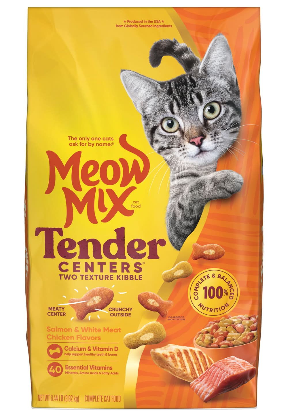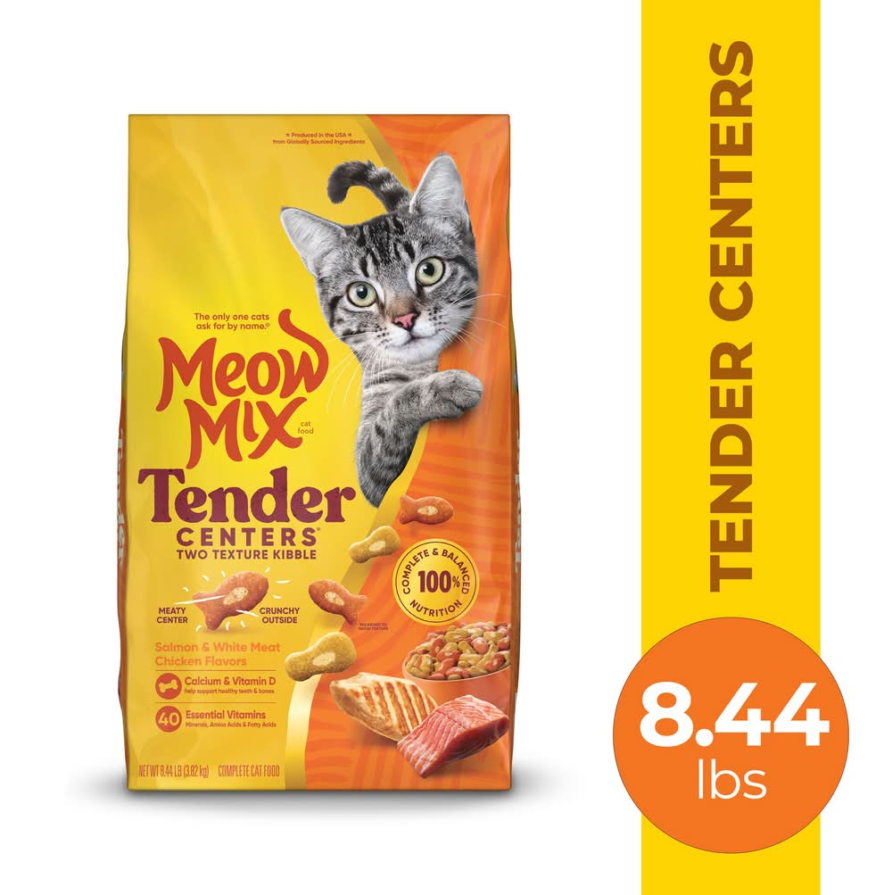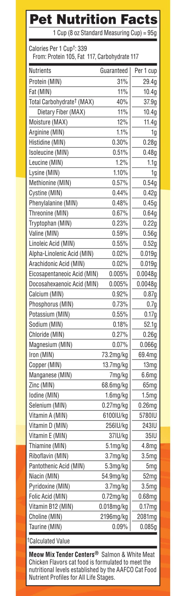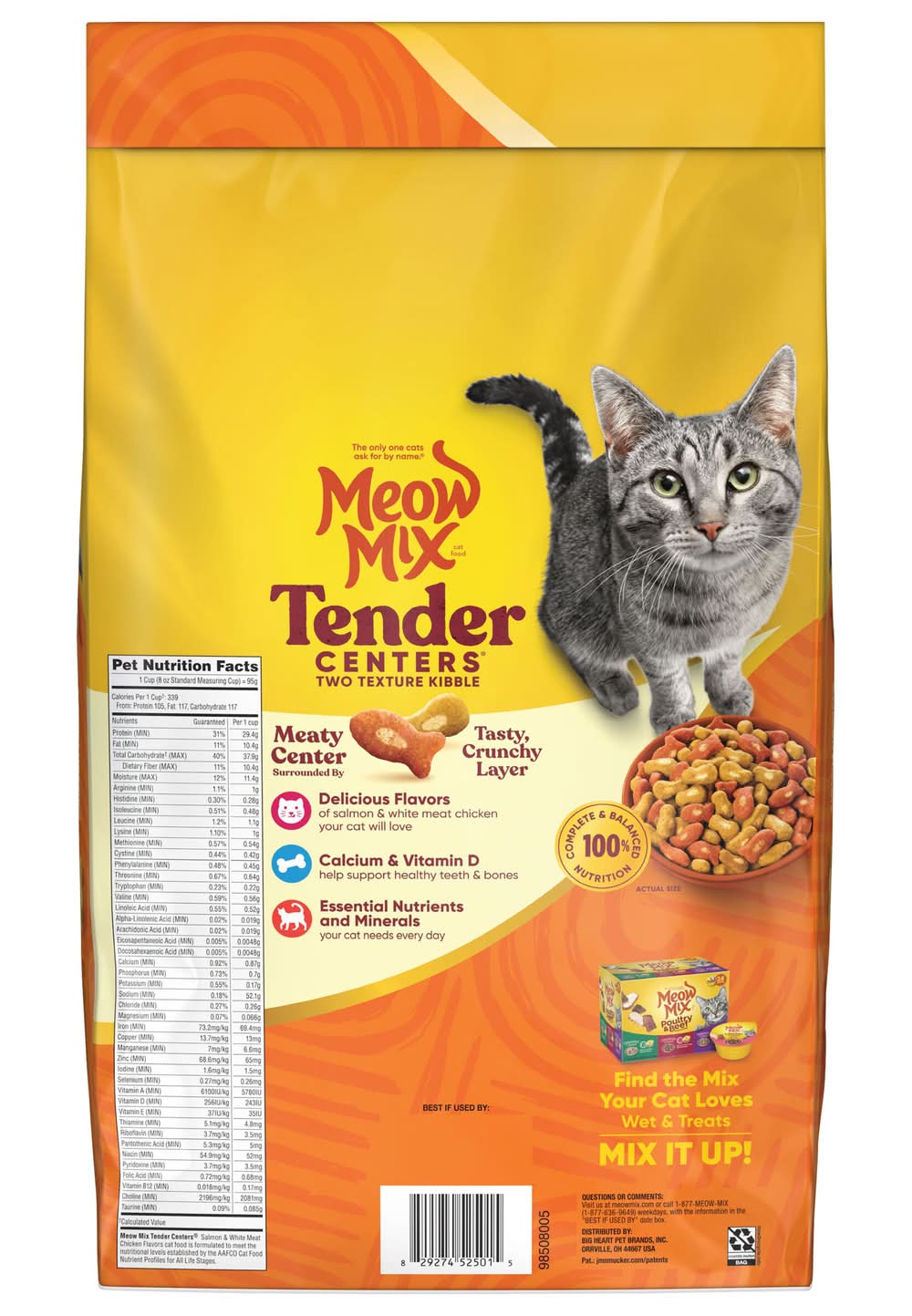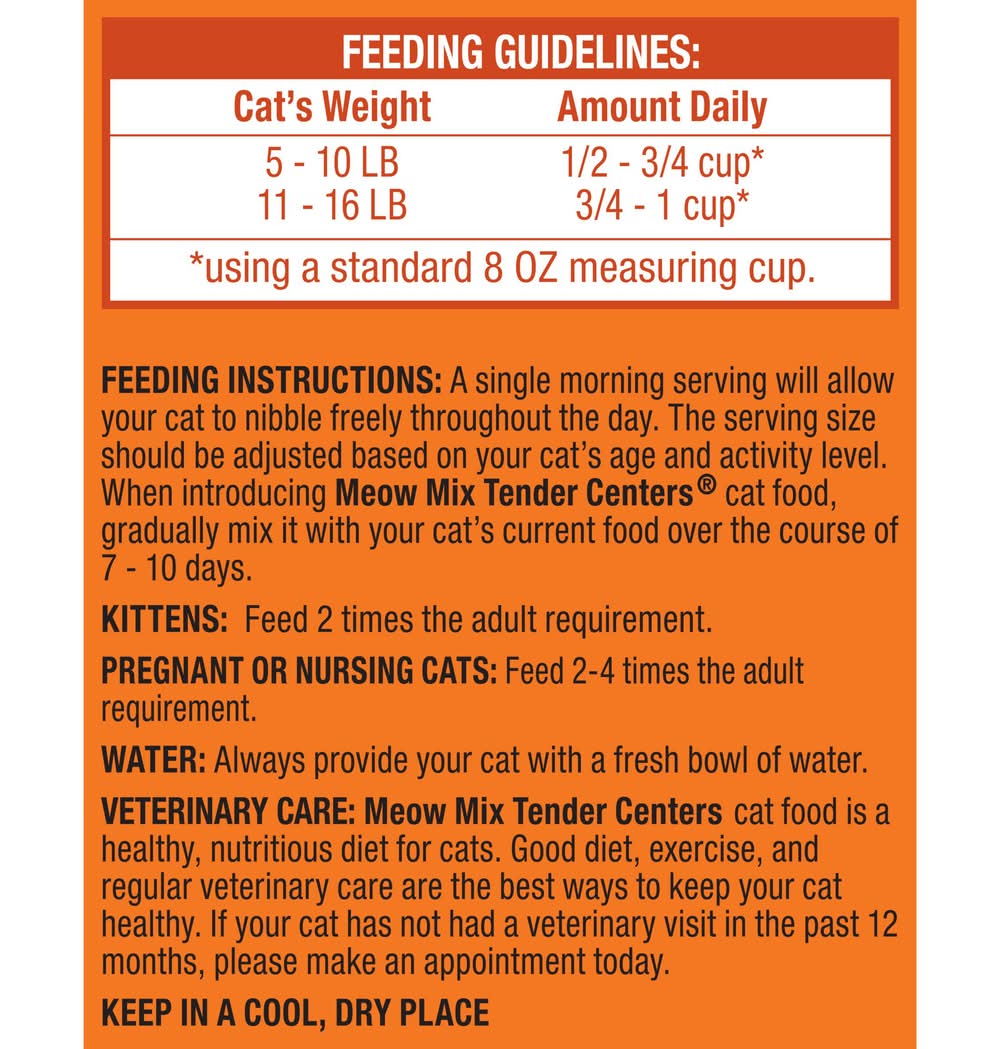 Directions: feeding guidelines: 5-9 lbs cat weight: 1/2 to 1 cup daily. 10-14 lb cat weight: 1 to 1-1/2 cups daily. using a standard 8 oz measuring cup. feeding instructions: a single morning serving will allow your cat to nibble freely throughout the day. the serving size should be adjusted based on your cat's age and activity level. when introducing meow mix tender centers cat food, gradually mix it with your cat's current food over the course of 7-10 days. kittens: feed 2 times the adult requirement. pregnant or nursing cats: feed 2-4 times the adult requirement. water: always provide your cat with a fresh bowl of water. veterinary care: meow mix tender centers cat food is a healthy, nutritious diet for cats. good diet, exercise, and regular veterinary care are the best ways to keep your cat healthy. if your cat has not had a veterinary visit in the past 12 months, please make an appointment today. changes in your cat's diet should be made gradually to allow your cat to become accustomed to a new food. substitute small amounts of the new food for the old food, gradually increasing the amount of the new food while decreasing the old food over a period of 7-10 days. keep in a cool, dry place.