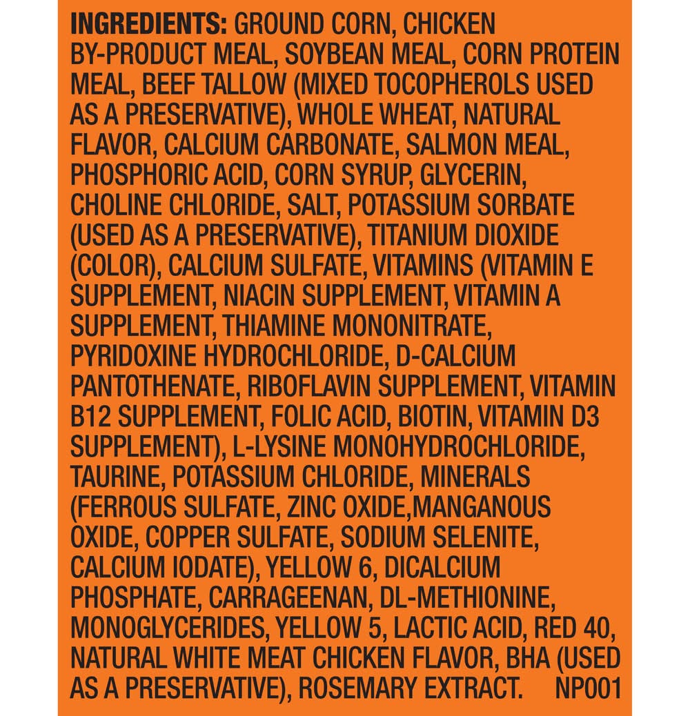 Ingredients: Ground Corn, Chicken By-Product Meal, Soybean Meal, Corn Protein Meal, Beef Tallow (Mixed Tocopherols Used As A Preservative), Whole Wheat, Natural Flavor, Calcium Carbonate, Salmon Meal, Phosphoric Acid, Corn Syrup, Glycerin, Choline Chloride, Salt, Potassium Sorbate (Used As A Preservative), Titanium Dioxide (Color), Calcium Sulfate, Vitamins (Vitamin E Supplement, Niacin Supplement, Vitamin A Supplement, Thiamine Mononitrate, Pyridoxine Hydrochloride, D-Calcium Pantothenate, Riboflavin Supplement, Vitamin B12 Supplement, Folic Acid, Biotin, Vitamin D3 Supplement), L-Lysine Monohydrochloride, Taurine, Potassium Chloride, Minerals (Ferrous Sulfate, Zinc Oxide, Manganous Oxide, Copper Sulfate, Sodium Selenite, Calcium Iodate), Yellow 6, Dicalcium Phosphate, Carrageenan, Dl-Methionine, Monoglycerides, Yellow 5, Lactic Acid, Red 40, Natural White Meat Chicken Flavor, Bha (Used As A Preservative), Rosemary Extract