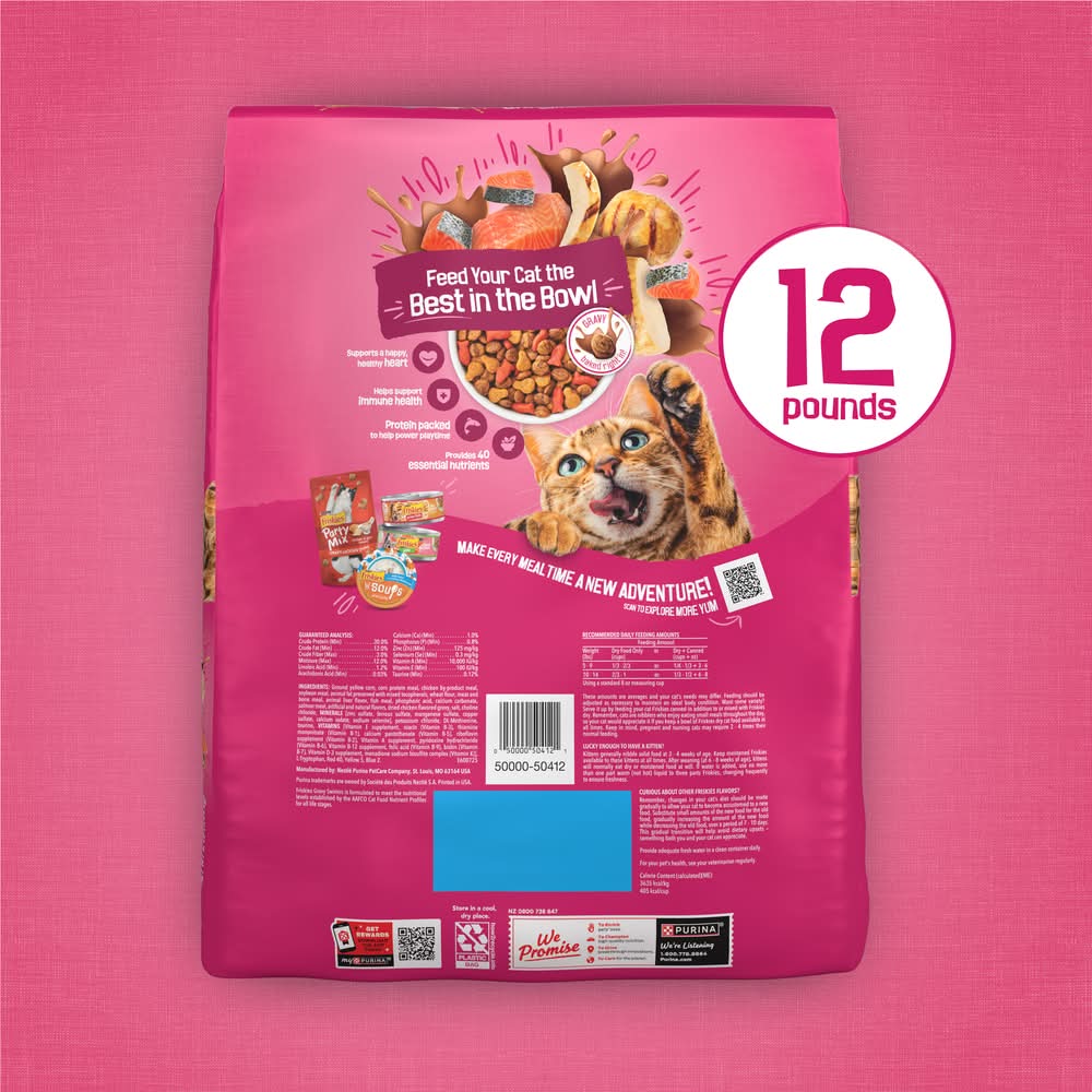 Bring the deliciousness of gravy mixed with two cat-approved flavors to your cat's dish with Purina Friskies Gravy Swirlers cat kibble. Savory salmon and chicken cat food flavors combine to create the taste cats crave with rich gravy swirls baked into each crunchy bite for added yum. Let the sound of the mouthwatering cat dry food hitting her bowl pique your cat's attention and watch as she delights in every last glorious bite. This protein-packed Friskies cat food recipe features 40 essential nutrients for a complete cat food that supports a happy, healthy heart and powers your cat’s playtime. Made for all cats, Friskies healthy dry cat food provides 100 percent complete and balanced nutrition and helps support immune health all wrapped in a delicious taste and crunchy texture cats love. Feed your cat the best in the bowl with irresistible crunchy kibble, and the tastes of savory chicken, salmon, and gravy every time you offer up Friskies Gravy Swirlers With Chicken, Salmon and Gravy Flavors.