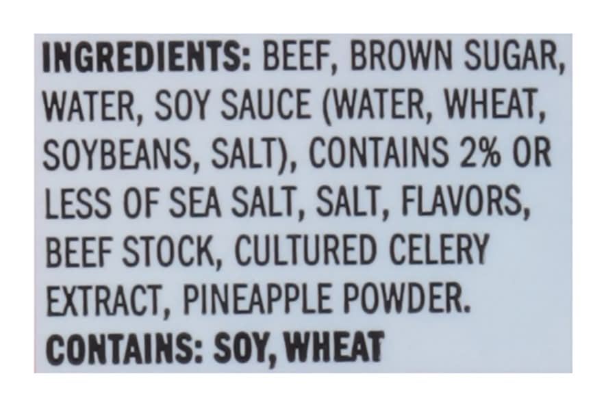 Ingredients: Beef, Brown Sugar, Water, Soy Sauce (Water, Wheat, Soybeans, Salt), Contains 2% or Less of Sea Salt, Salt, Flavors, Beef Stock, Cultured Celery Extract, Pineapple Powder