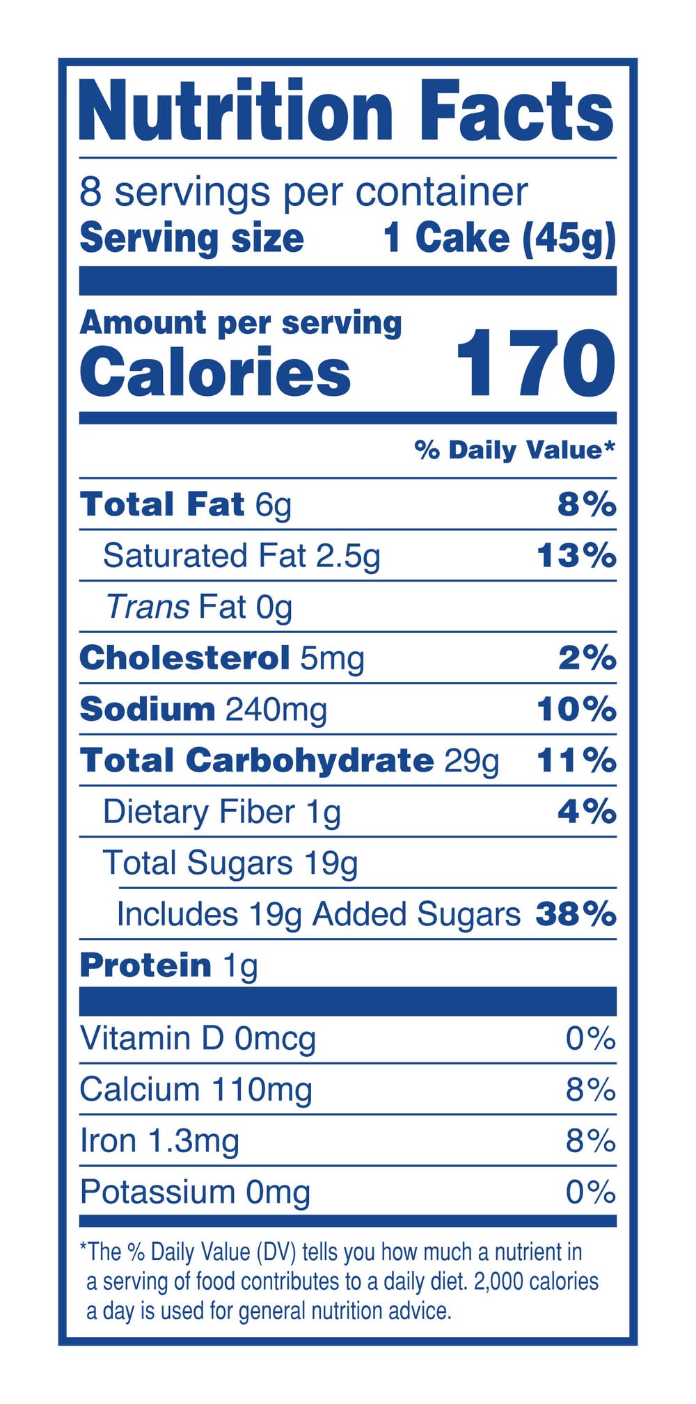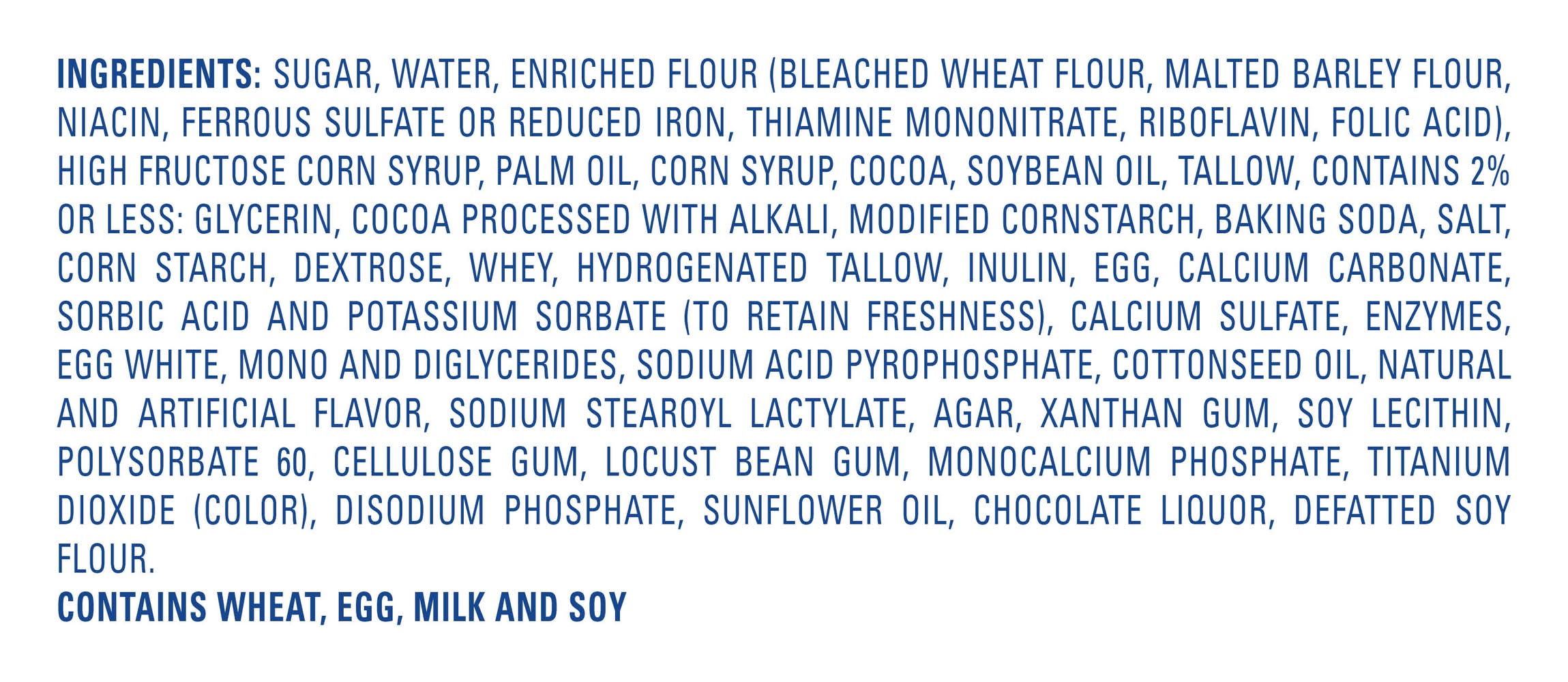 Ingredients: Sugar, Water, Enriched Flour (Bleached Wheat Flour, Malted Barley Flour, Niacin, Ferrous Sulfate Or Reduced Iron, Thiamine Mononitrate, Riboflavin, Folic Acid), High Fructose Corn Syrup, Palm Oil, Corn Syrup, Cocoa, Soybean Oil, Tallow, Contains 2% Or Less: Glycerin, Cocoa Processed With Alkali, Modified Cornstarch, Baking Soda, Salt, Corn Starch, Dextrose, Whey, Hydrogenated Tallow, Inulin, Egg, Calcium Carbonate, Sorbic Acid And Potassium Sorbate (To Retain Freshness), Calcium Sulfate, Enzymes, Egg White, Mono And Diglycerides, Sodium Acid Pyrophosphate, Cottonseed Oil, Natural And Artificial Flavor, Sodium Stearoyl Lactylate, Agar, Xanthan Gum, Soy Lecithin, Polysorbate 60, Cellulose Gum, Locust Bean Gum, Monocalcium Phosphate, Titanium Dioxide (Color), Disodium Phosphate, Sunflower Oil, Chocolate Liquor, Defatted Soy Flour. Contains Wheat, Egg, Milk And Soy Contains Bioengineered Food Ingredients Contains: Milk, Eggs, Soybeans, Wheat, Barley, Corn