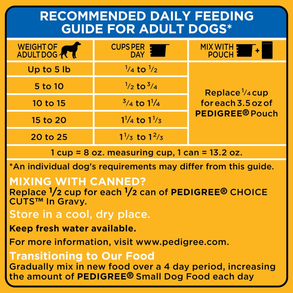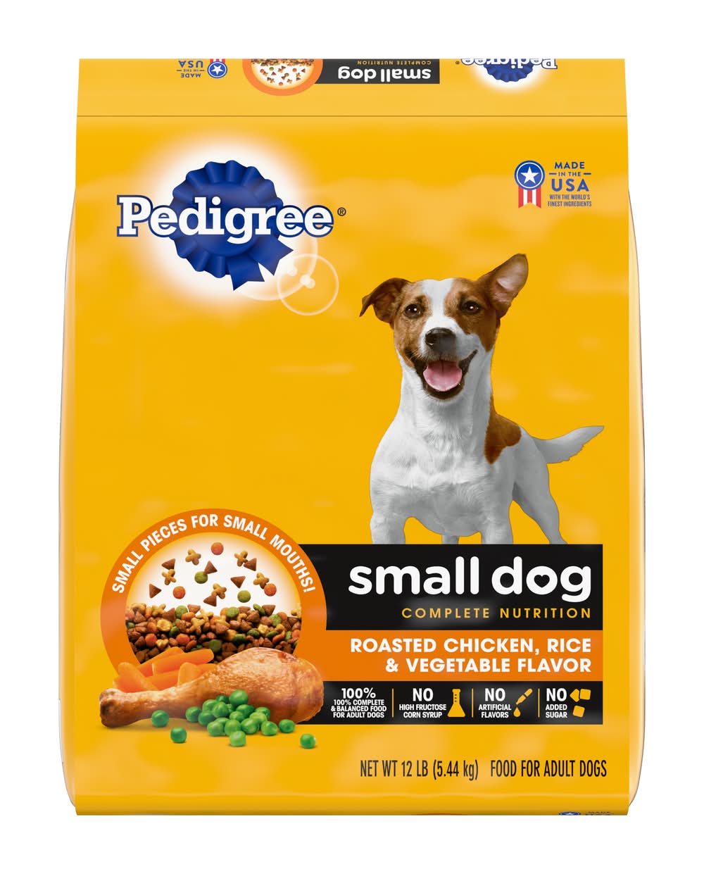 Even little dogs need a large amount of nutrition. That's why every bag of PEDIGREE Small Dog Roasted Chicken, Rice & Vegetable Flavor Dry Dog Food has the vitamins and minerals small breed dogs need to be healthy and happy. Made with high quality whole grains, protein and omega-6 fatty acids, PEDIGREE Small Dog Food helps your canine look and feel their best. Best of all, our oral care kibble gently cleans their teeth with every bite. No high fructose corn syrup, no artificial flavors, and no added sugar.