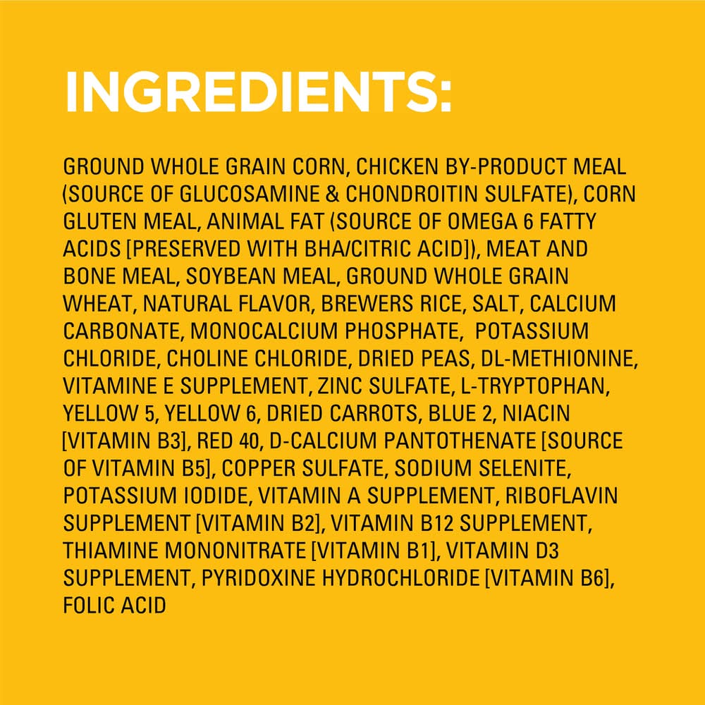 Ingredients: INGREDIENTS: Ground Whole Grain Corn, Chicken By-Product Meal (Source Of Glucosamine Chondroitin Sulfate), Corn Gluten Meal, Animal Fat (Source Of Omega 6 Fatty Acids [Preserved With BHA/Citric Acid]), Meat And Bone Meal, Soybean Meal, Ground Whole Grain Wheat, Natural Flavor, Brewers Rice, Salt, Calcium Carbonate, Monocalcium Phosphate, Potassium Chloride, Choline Chloride, Dried Peas, DL-Methionine, Vitamin E Supplement, Zinc Sulfate, L-Tryptophan, Yellow 5, Yellow 6, Dried Carrots, Blue 2, Niacin [Vitamin B3], Red 40, D-Calcium Pantothenate [Source Of Vitamin B5], Copper Sulfate, Sodium Selenite, Potassium Iodide, Vitamin A Supplement, Riboflavin Supplement [Vitamin B2], Vitamin B12 Supplement, Thiamine Mononitrate [Vitamin B1], Vitamin D3 Supplement, Pyridoxine Hydrochloride [Vitamin B6], Folic Acid.