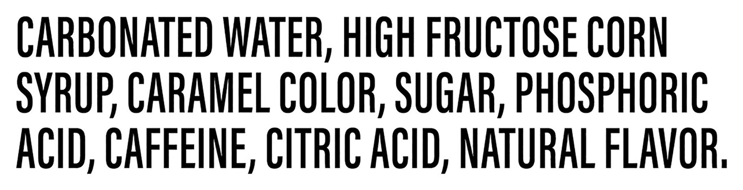 Ingredients: Carbonated Water, High Fructose Corn Syrup, Caramel Color, Sugar, Phosphoric Acid, Caffeine, Citric Acid, Natural Flavor