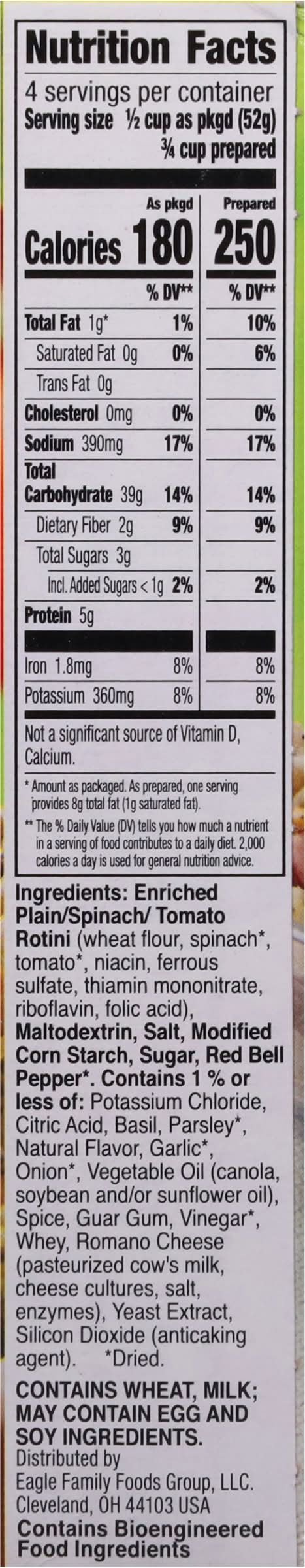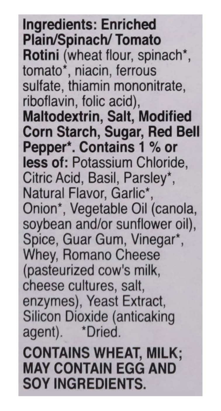 Ingredients: Enriched Plain/Spinach/Tomato Rotini (Wheat Flour Spinach (Dried), Tomato (Dried), Niacin, Ferrous Sulfate, Thiamin Mononitrate, Riboflavin, Folic Acid), Maltodextrin, Salt, Modified Corn Starch, Sugar, Red Bell Pepper (Dried), Contains 1% or Less of: Potassium Chloride, Citric Acid, Basil, Parsley (Dried), Natural Flavor, Garlic (Dried), Onion (Dried), Vegetable Oil (Canola Soybean and/or Sunflower Oil), Spice, Guar Gum, Vinegar (Dried), Whey, Romano Cheese (Pasteurized Cow's Milk Cheese Cultures Salt Enzymes), Yeast Extract, Silicon Dioxide (Anticaking Agent) Contains: Wheat, Corn, Soybeans, Milk, Eggs, Soybeans