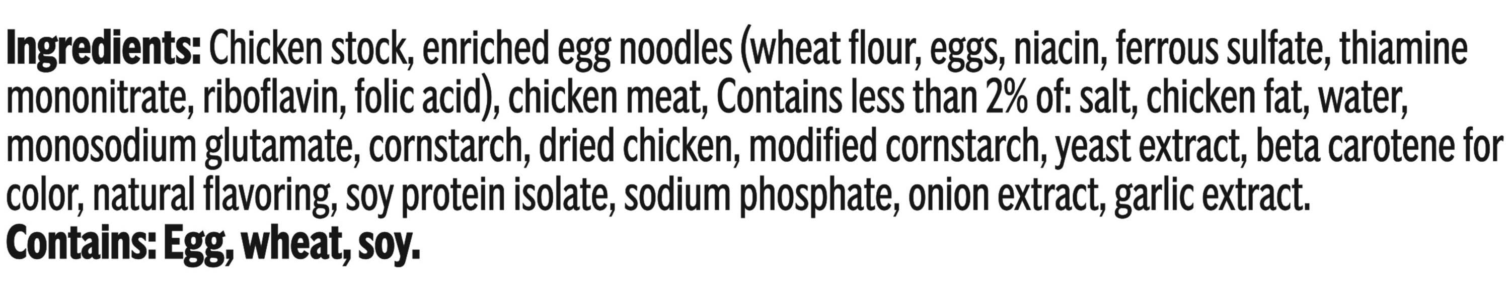 Ingredients: INGREDIENTS: CHICKEN STOCK, ENRICHED EGG NOODLES (WHEAT FLOUR, EGGS, NIACIN, FERROUS SULFATE, THIAMINE MONONITRATE, RIBOFLAVIN, FOLIC ACID), CHICKEN MEAT, CONTAINS LESS THAN 2% OF: SALT, CHICKEN FAT, WATER, MONOSODIUM GLUTAMATE, CORNSTARCH, DRIED CHICKEN, MODIFIED CORNSTARCH, YEAST EXTRACT, BETA CAROTENE FOR COLOR, NATURAL FLAVORING, SOY PROTEIN ISOLATE, SODIUM PHOSPHATE, ONION EXTRACT, GARLIC EXTRACT. CONTAINS: EGG, WHEAT, SOY Contains: CONTAINS: Egg, Gluten, Soybean, Wheat