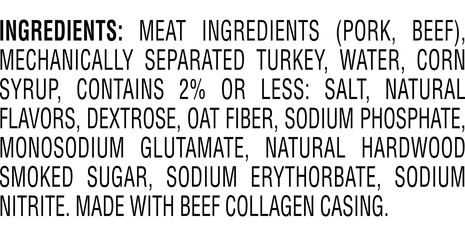 Ingredients: Meat Ingredients (Pork, Beef), Mechanically Separated Turkey, Water, Corn syrup, Contains 2% or Less: Salt, Natural Flavors, Dextrose, Oat Fiber, Sodium Phosphate, Monosodium Glutamate, Natural Hardwood Smoked Sugar, Sodium Erythorbate, Sodium Nitrite. Made with beef collagen casing. Contains: Soy