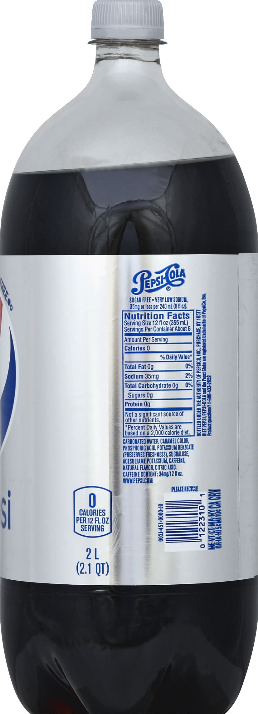 0 calories per 12 fl oz serving. Caffeine Content: 35 mg/12 fl oz. Pepsi.com. how2recycle.info. Scan for more food information or call 800-433-2652. Smartlabel. We're here to help. Pepsi.com or 800-433-2652. Refresh then recycle. Packaging: Reusable