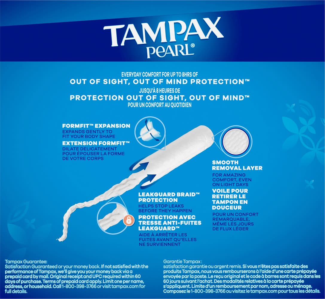 All day (up to 8 hr) comfort & protection. Leakage protection. 18 Regular (absorbency); 8 Super (absorbency); 8 Super Plus (absorbency). Everyday comfort for up to 8 hrs of out of sight, out of mind protection. Formfit expansion: Expands gently to fit your body shape. Smooth Removal Layer: For amazing comfort, even on light days. Leakguard Braid Protection: Helps stop leaks before they happen. US gynecologist recommended tampon brand (based on a 2020 survey). Free of perfume.Free of elemental chlorine bleaching. Tampon free of dyes. Clinically tested gentle to skin. Our best pearl protection ever.