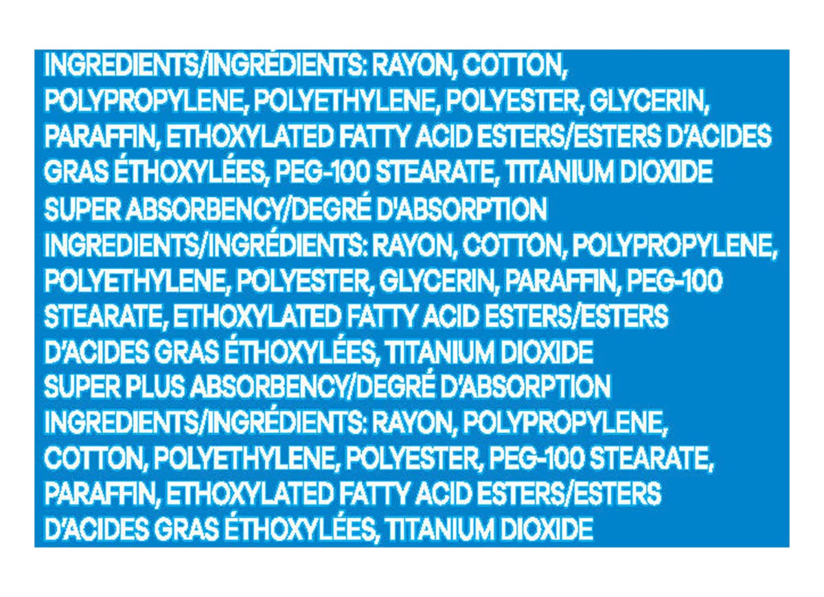 Ingredients: Regular Absorbency: Rayon, Cotton, Polypropylene, Polyethylene, Polyester, Glycerin, Paraffin, Ethoxylated Fatty Acid Esters/Esters D'acides Gras Éthoxylées, PEG-100 Stearate, Titanium Dioxide. Super Absorbency: Rayon, Cotton, Polypropylene, Polyethylene, Polyester, Glycerin, Paraffin, PEG-100 Stearate, Ethoxylated Fatty Acid Esters/Esters D'acides Gras Éthoxylées, Titanium Dioxide. Super Plus Absorbency: Rayon, Polypropylene, Cotton, Polyethylene, Polyester, PEG-100 Stearate, Paraffin, Ethoxylated Fatty Acid Esters/Esters D'acides Gras Éthoxylées, Titanium Dioxide