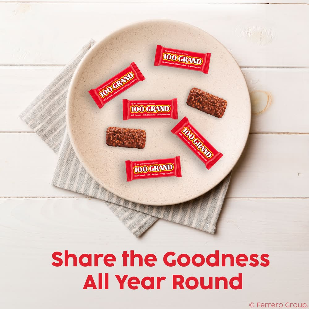 Enjoy the rich, chewy caramel of this 100 Grand candy bar. This Fun Size shareable bag is an everyday treat featuring rich chewy caramel, crispy crunchies, and milk chocolate. It is a perfect snackable size, making them perfect for sharing at home, at the office, or during a movie night. Stock up on this shareable bag for easy treats anytime, perfect for sharing with friends, family, or coworkers. 100 Grand candy bars are made with rich chewy caramel, milk chocolate and crispy rice crunchies without any artificial flavors or colors, making them a satisfying bulk candy choice for all occasions. Each bar is conveniently individually wrapped, easy for tossing into a lunchbox, stashing at your desk or enjoying during your next movie night. Perfect as a Halloween candy chocolate fun size bar, Easter baskets, Valetine's Day surprises or as a holiday gift Flavor: Rich caramel