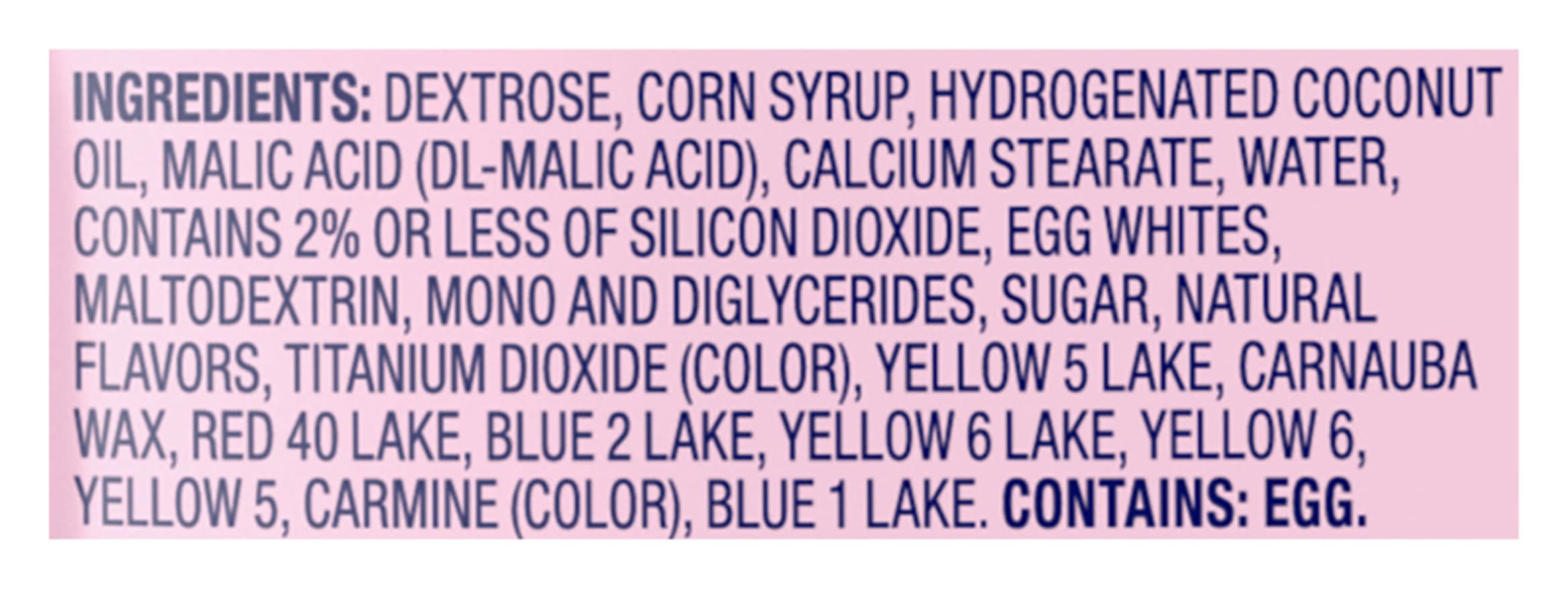 Ingredients: DEXTROSE, CORN SYRUP, HYDROGENATED COCONUT OIL, MALTODEXTRIN, 2% OR LESS OF MALIC ACID (DL-MALIC ACID), CALCIUM STEARATE, EGG WHITES, NATURAL FLAVORS, MONO- AND DIGLYCERIDES, CARNAUBA WAX, BLUE 1 LAKE, BLUE 2 LAKE, RED 40 LAKE, YELLOW 5 LAKE, YELLOW 6 LAKE. Contains: CONTAINS: EGG.