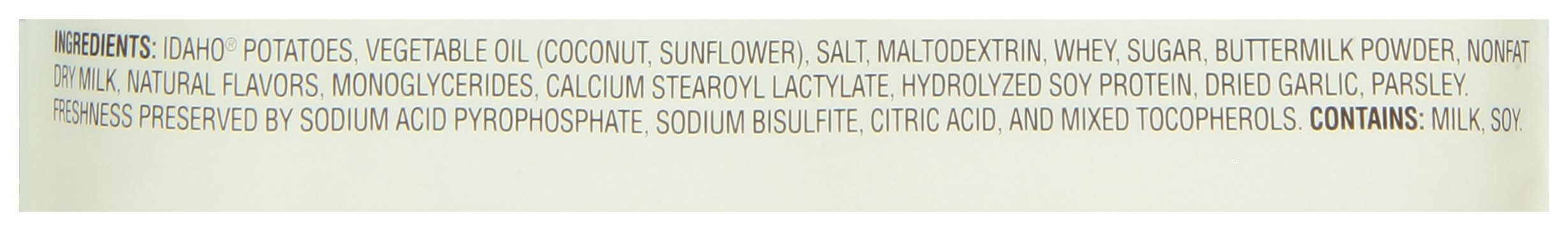 Ingredients: IDAHO® POTATOES, VEGETABLE OIL (COCONUT, SUNFLOWER), SALT, MALTODEXTRIN, WHEY, SUGAR, BUTTERMILK POWDER, NONFAT DRY MILK, NATURAL FLAVORS, MONOGLYCERIDES, CALCIUM STEAROYL LACTYLATE, HYDROLYZED SOY PROTEIN, DRIED GARLIC, PARSLEY. FRESHNESS PRESERVED BY SODIUM ACID PYROPHOSPHATE, SODIUM BISULFITE, CITRIC ACID, AND MIXED TOCOPHEROLS. Contains: Milk, Soy