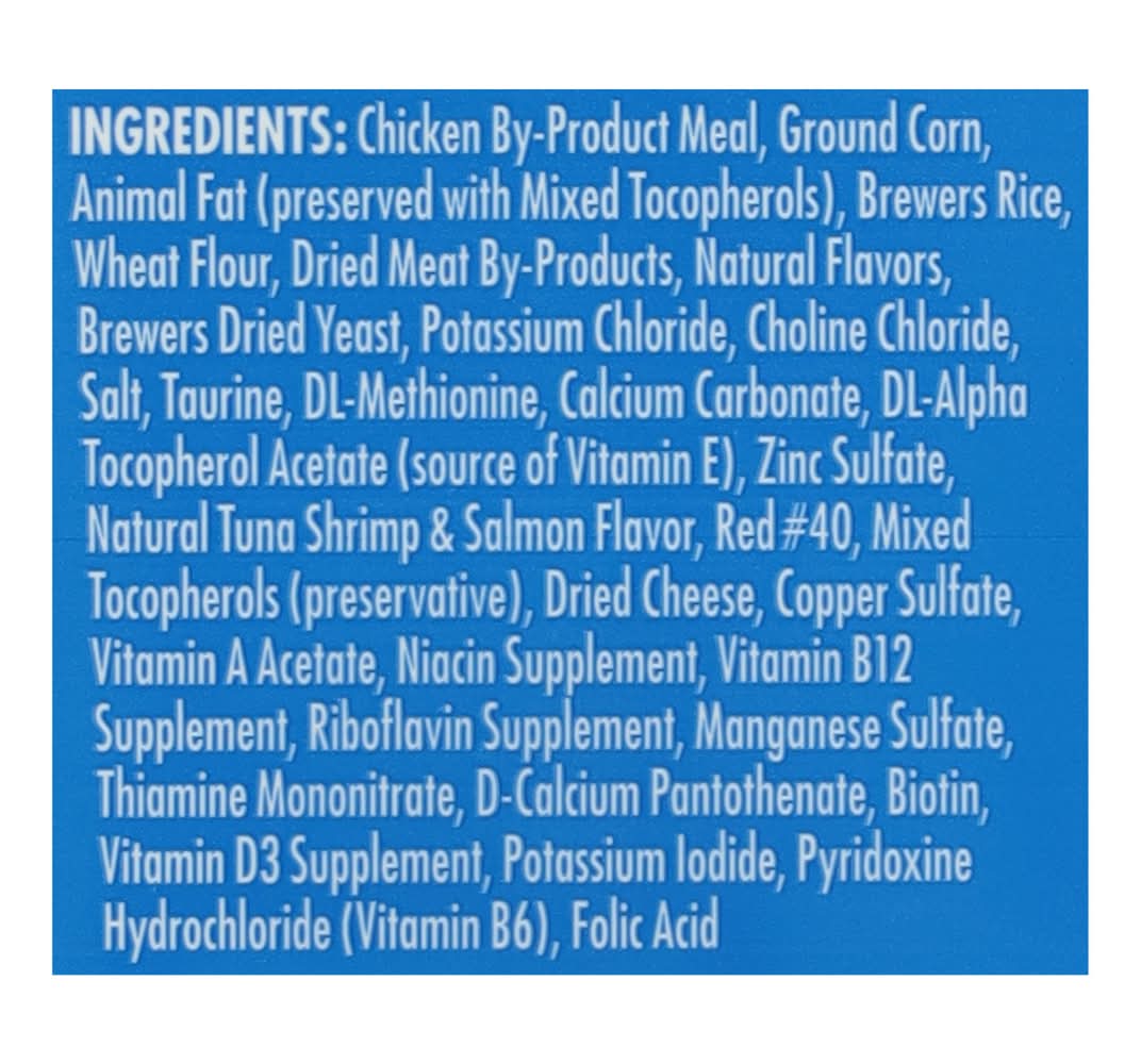 Ingredients: Chicken By-Product Meal, Ground Corn, Animal Fat (Preserved with Mixed Tocopherols), Brewers Rice, Wheat Flour, Dried Meat By-Products, Natural Flavors, Brewers Dried Yeast, Potassium Chloride, Choline Chloride, Salt, Taurine, DL-Methionine, Calcium Carbonate, DL-Alpha Tocopherol Acetate (Source of Vitamin E), Zinc Sulfate, Natural Tuna Shrimp & Salmon Flavor, Red 40, Mixed Tocopherols (Preservative), Dried Cheese, Copper Sulfate, Vitamin A Acetate, Niacin Supplement, Vitamin B12 Supplement, Riboflavin Supplement, Manganese Sulfate, Thiamine Mononitrate, D-Calcium Pantothenate, Biotin, Vitamin D3 Supplement, Potassium Iodide, Pyridoxine Hydrochloride (Vitamin B6), Folic Acid Contains: Corn, Wheat, Fish, Salmon, Fish, Tuna, Crustacean Shellfish, Shrimp