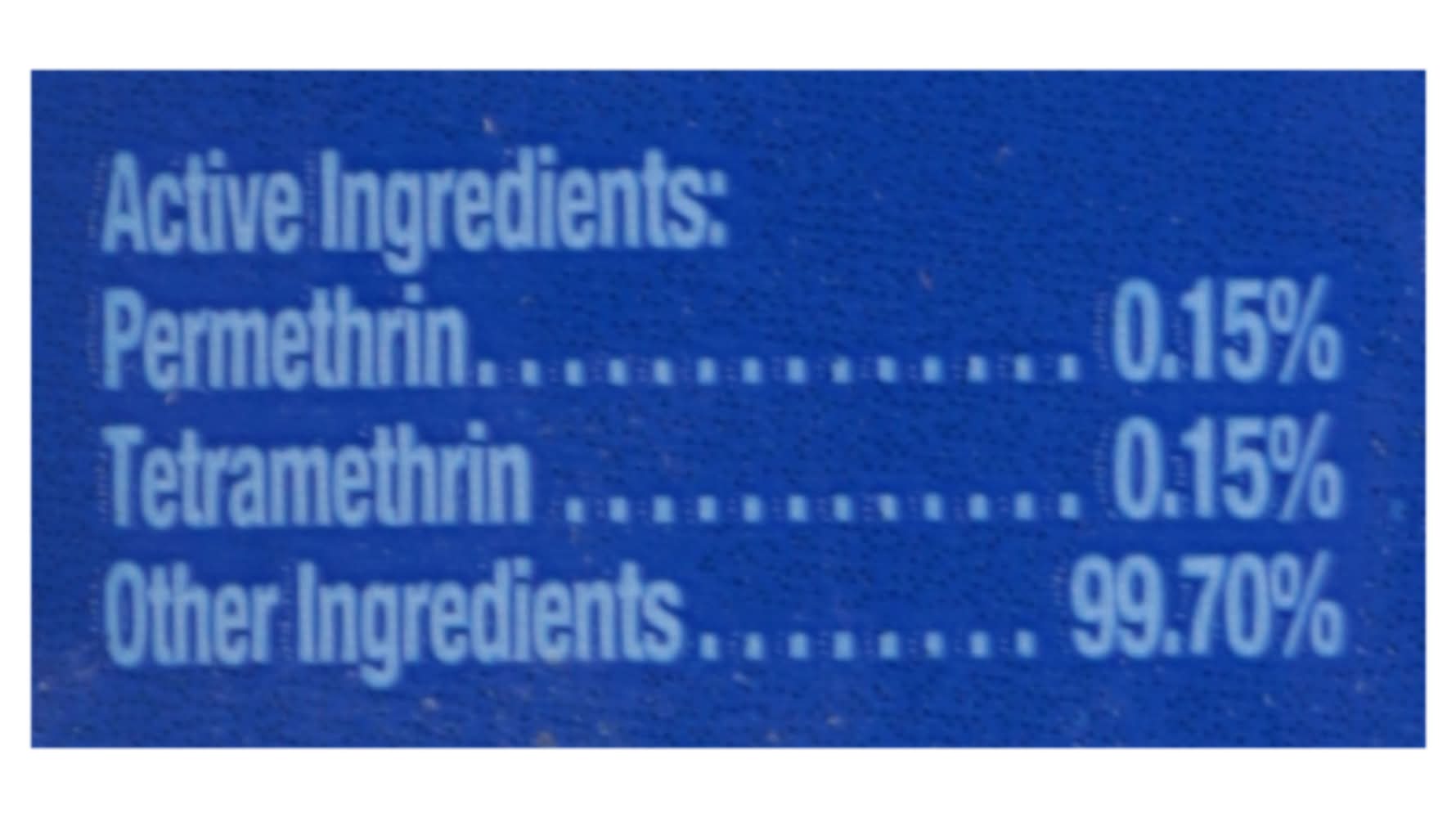 Ingredients: Active Ingredients: Permethrin: 0.15%, Tetramethrin: 0.15%, Other Ingredients: 99.70%