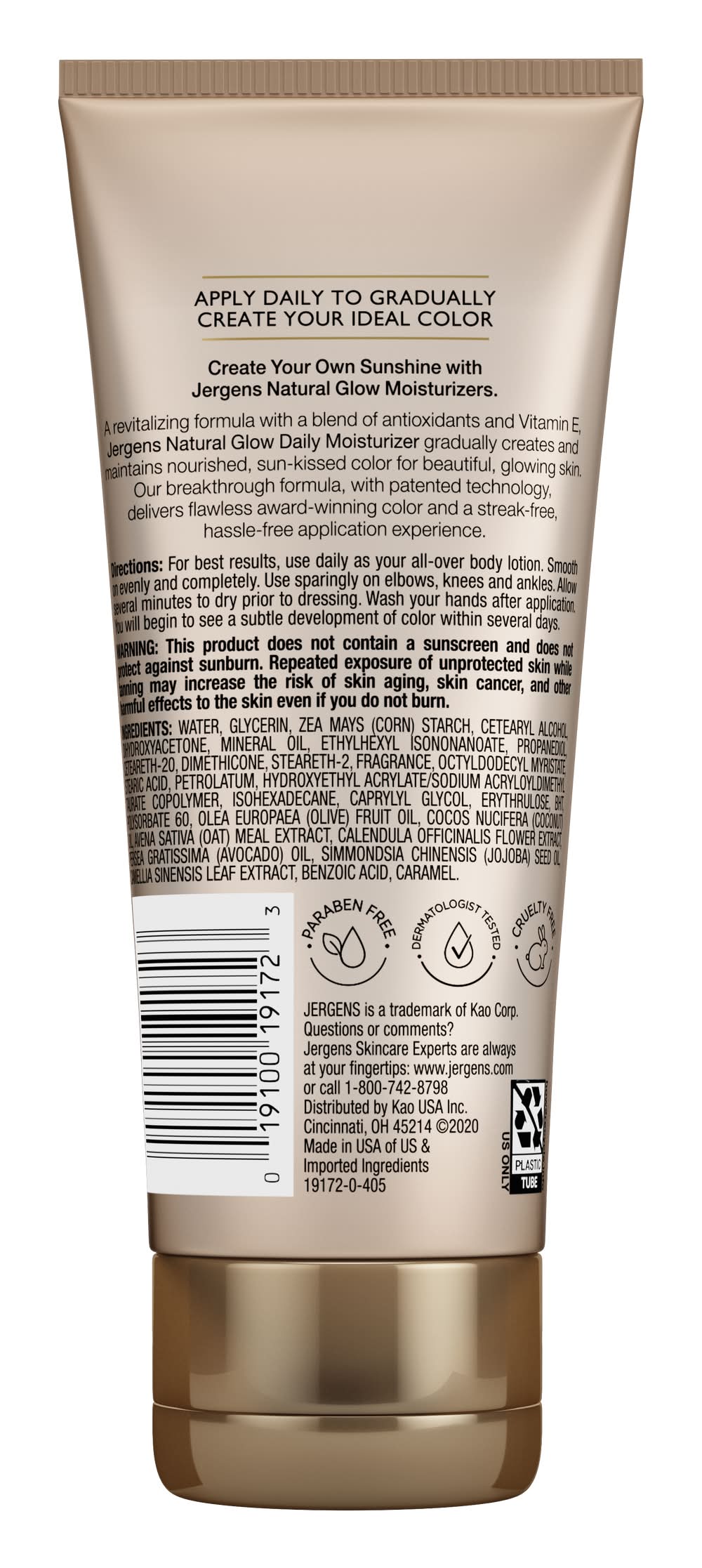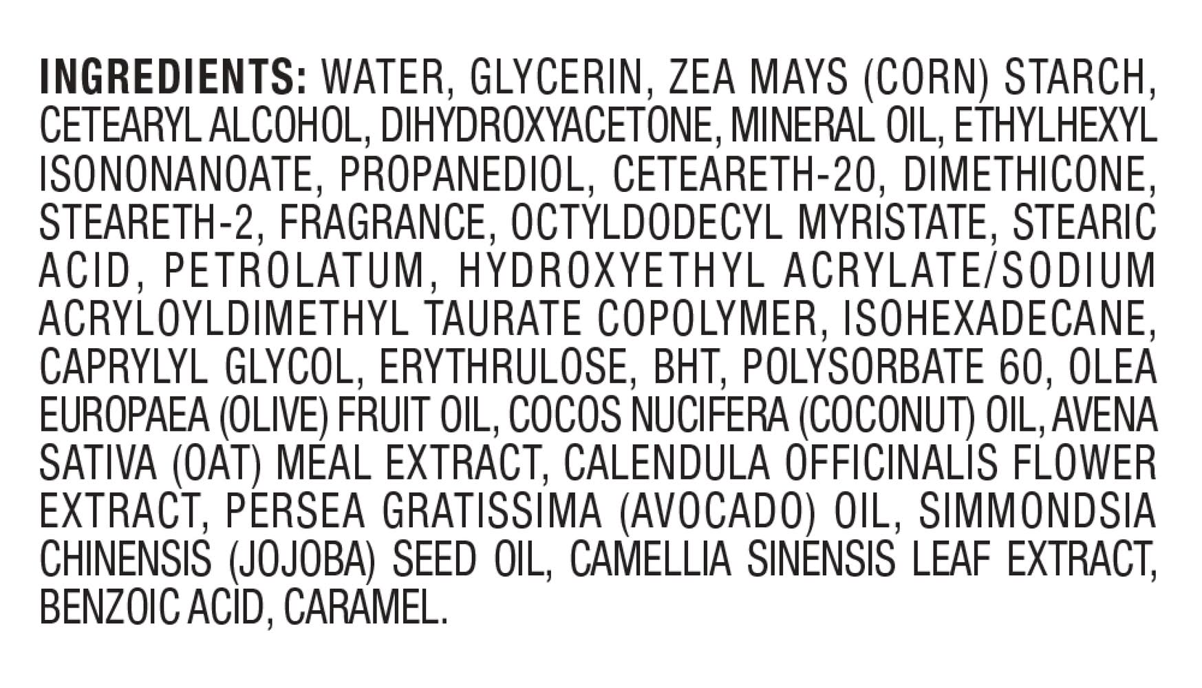 Ingredients: Water, Glycerin, Zea Mays (Corn) Starch, Cetearyl Alcohol, Dihydroxyacetone, Mineral Oil, Ethylhexyl Isononanoate, Propanediol, Ceteareth-20, Dimethicone, Steareth-2, Fragrance, Octyldodecyl Myristate, Stearic Acid, Petrolatum, Hydroxyethyl Acrylate/Sodium Acryloyldimethyl Taurate Copolymer, Isohexadecane, Caprylyl Glycol, Erythrulose, BHT, Polysorbate 60, Olea Europaea (Olive) Fruit Oil, Cocos Nucifera (Coconut) Oil, Avena Sativa (Oat) Meal Extract, Calendula Officinalis Flower Extract, Persea Gratissima (Avocado) Oil, Simmondsia Chinensis (Jojoba) Seed Oil, Camellia Sinensis Leaf Extract, Benzoic Acid, Caramel
