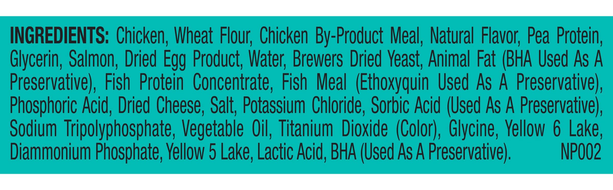 Ingredients: Chicken, Wheat Flour, Animal Digest, Chicken By-product Meal, Pea Protein, Brewers Dried Yeast, Glycerin, Salmon, Dried Egg Product, Water, Animal Fat (bha Used As A Preservative), Fish Protein Concentrate, Fish Meal (preserved With Ethoxyquin), Phosphoric Acid, Dried Cheese, Salt, Potassium Chloride, Sorbic Acid (used As A Preservative), Vegetable Oil, Titanium Dioxide (color), Yellow 6 Lake, Yellow 5 Lake, Lactic Acid, Bha (used As A Preservative). Contains: Wheat, Fish, Eggs